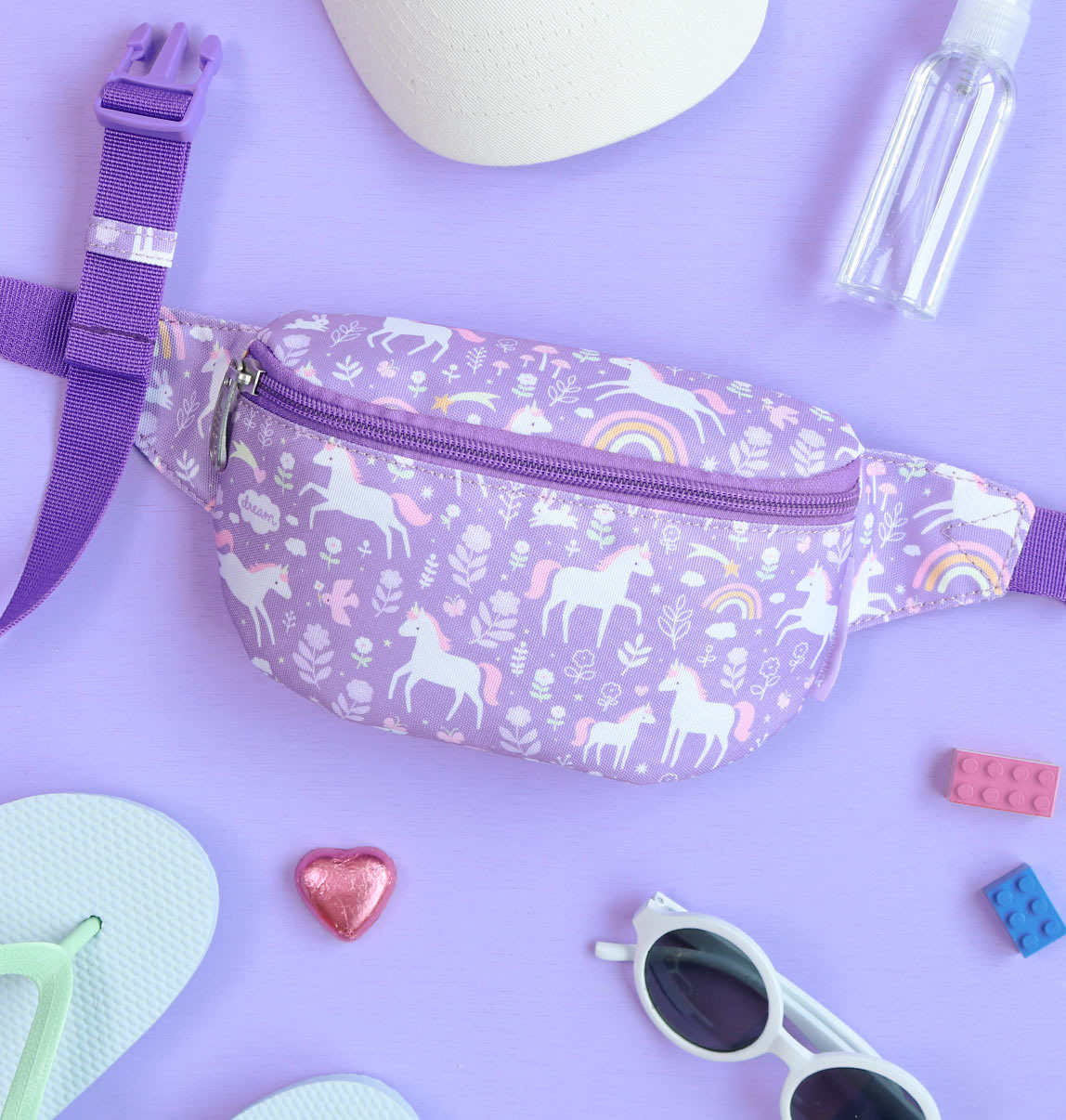 Lilafarbene Gürteltasche mit Einhörnern, Blumen und Regenbögen in Kindergröße. Die Tasche verfügt über einen verstellbaren Tragegurt, sodass die Tasche auch als Crossbody Bag getragen werden kann. In die Vordertasche passen bequem Geldbörse und Handy. Auf der Rückseite befindet sich eine zusätzliche Reißverschlusstasche, die sich ideal für kleine Wertgegenstände eignet.