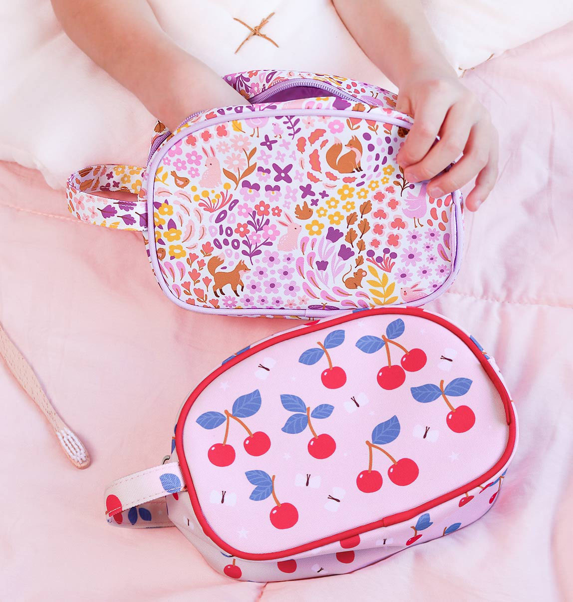 Passend zu den Reisetaschen, gibt es in den gleichen süssen Sujets die Kulturbeutel.