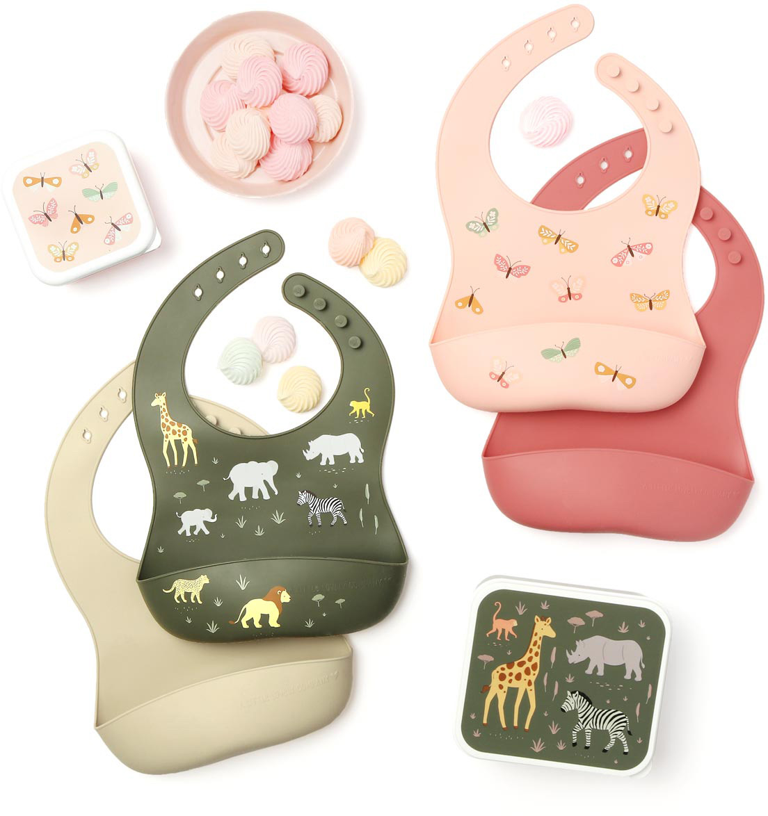 Set mit zwei Silikonlätzchen - eines mit Schmetterlingenaufdruck und eines in passender Unifarbe. Die Lätzchen bestehen aus weichem, food-grade Silikon, sind wasser- und schmutzabweisend und haben eine breite Tasche auf der Vorderseite, die sich ideal zum Auffangen von Essen eignet. Der verstellbare Halsverschluss macht sie für Babys und Kleinkinder geeignet. Die Silikonlätzchen sind leicht zu reinigen und durch Aufrollen leicht zu verstauen.