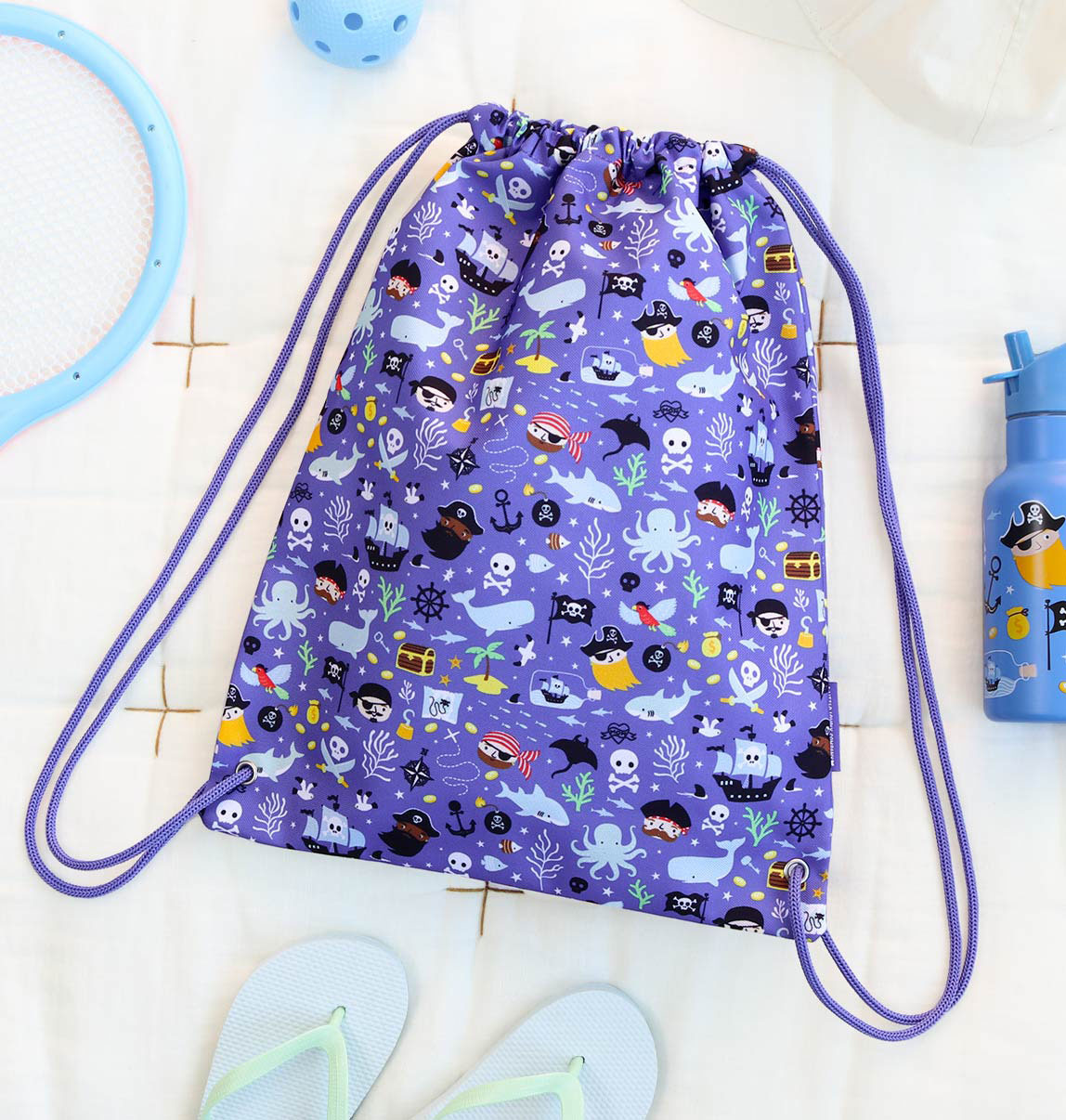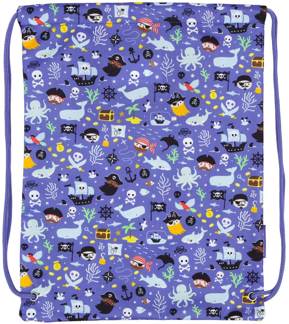 Dieser blaue Turnbeutel mit Piraten ist ideal als Sporttasche für die Schule oder den Schwimmunterricht geeignet. Der Beutel ist leicht, einfach zu öffnen und zu schließen und hat eine Innentasche mit Reißverschluss, um Wertsachen sicher aufzubewahren.