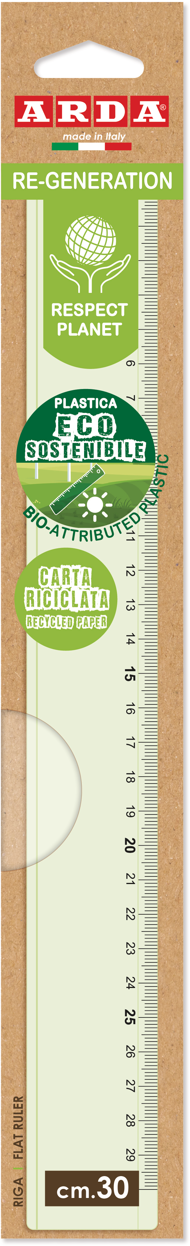 Massstab 30cm Re-Generation, hellgrün, transparent mit heissgeprägter Skalierung. Material aus biologisch abbaubarem Kunststoff. 100% recycelbar. Verpackung aus Recycling-Papier. Geeignet für die Schule, das Büro und für die Verwendung zu Hause.