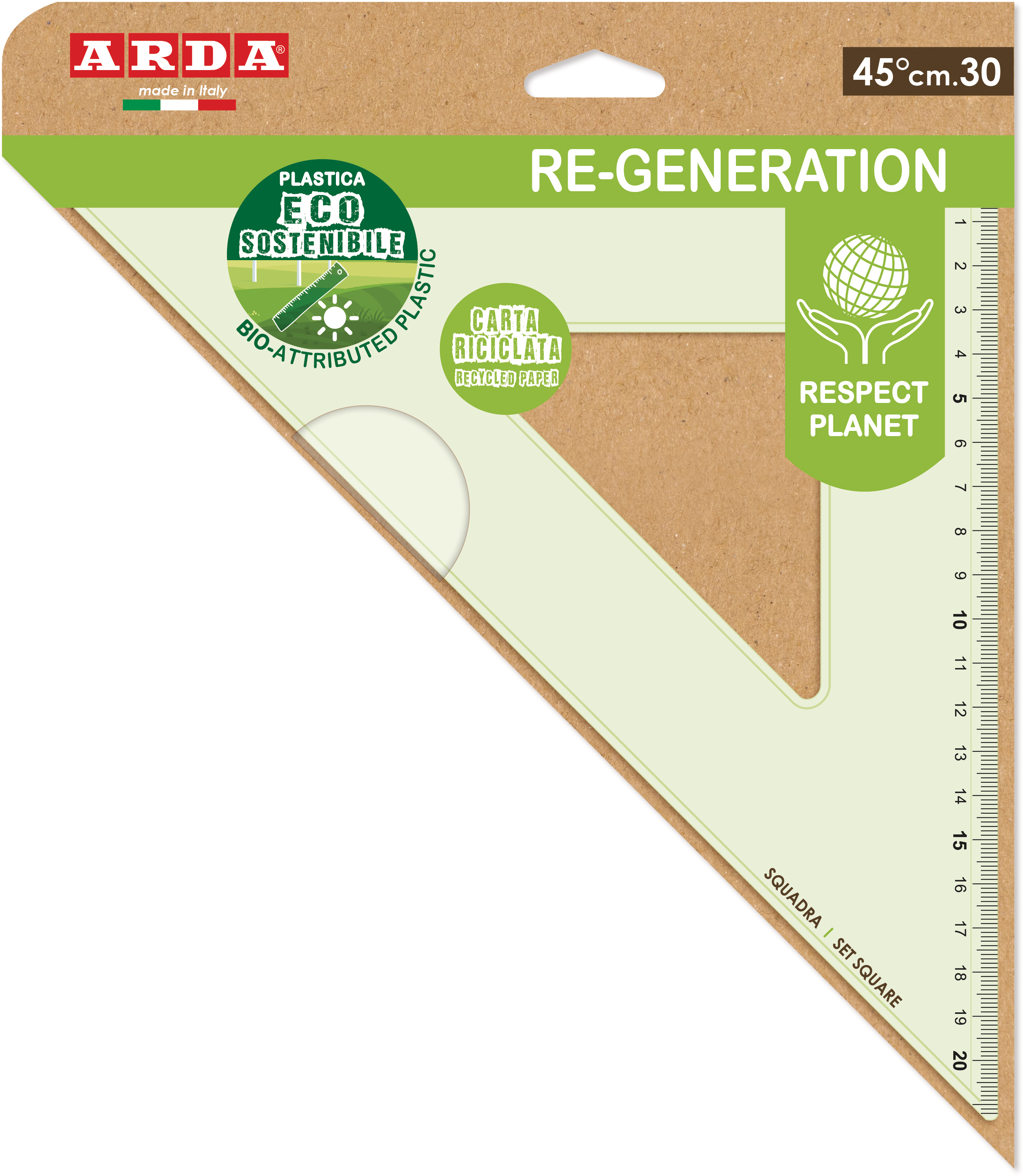 Winkel 30cm 45° Re-Generation, hellgrün, transparent mit heissgeprägter Skalierung. Material aus biologisch abbaubarem Kunststoff. 100% recycelbar. Verpackung aus Recycling-Papier. Geeignet für die Schule, das Büro und für die Verwendung zu Hause.