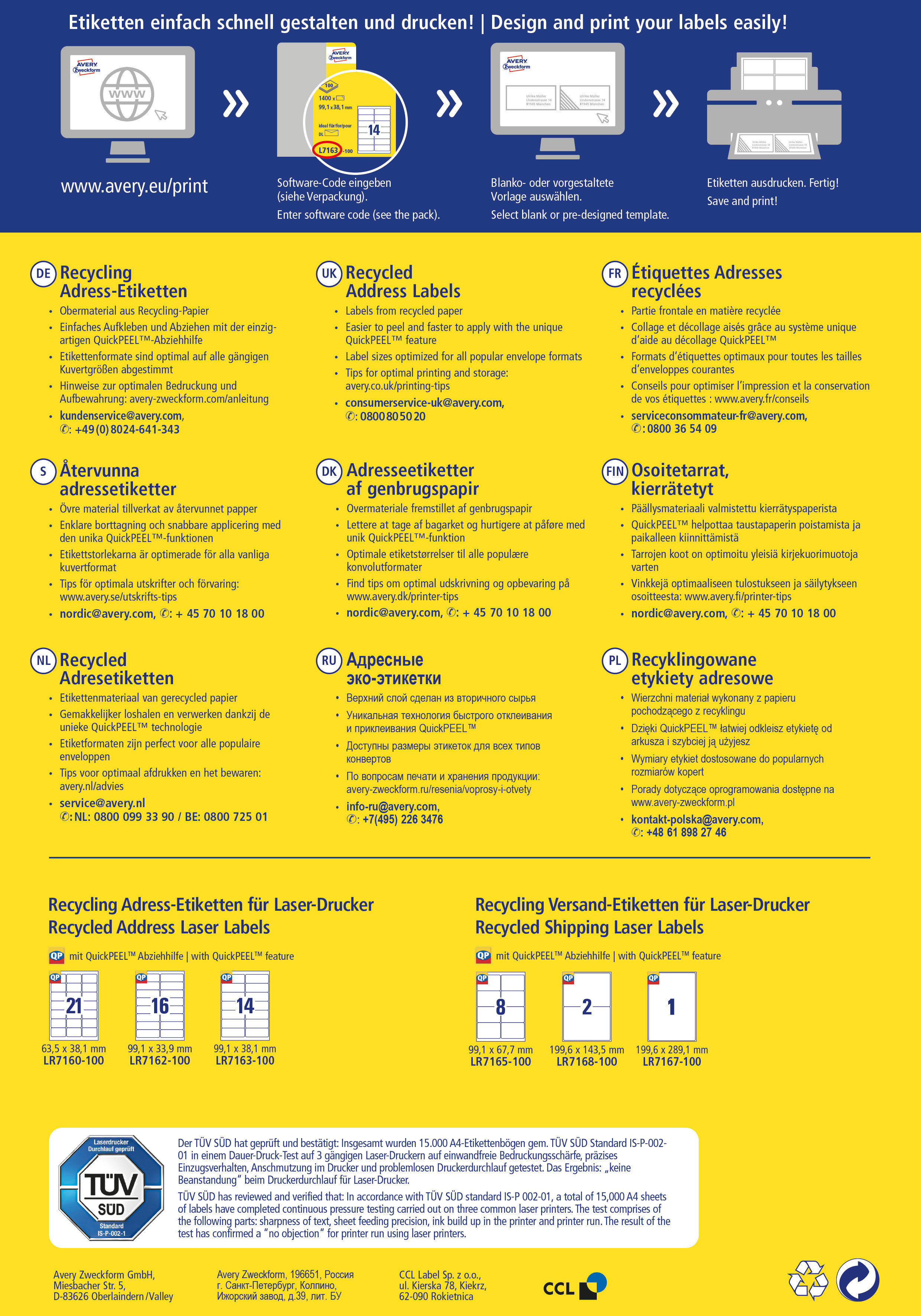 Qualität vom Etiketten-Experten: die naturweissen Recycling Adress-Etiketten LR7160-100 für Laser-Drucker im Format 63,5 x 38,1 mm von Avery Zweckform eignen sich z.B. ideal für C6 Kuverts oder für die Deutsche Post INTERNETMARKE (2.100 Etiketten/Packung). Das Beste für die Umwelt: das Etiketten-Material der umweltfreundlichsten Etiketten von Avery Zweckform besteht zu 100% chlorfrei gebleichtem Altpapier. Der Klebstoff ist wasserbasiert und das Produkt ist ausgezeichnet mit dem Blauen Engel. Bei der Herstellung entstehen weniger Emissionen, die Produktionsabfälle werden komplett wiederverwertet. Das ist Nachhaltigkeit „Made in Germany“ und die erste Wahl für die Zukunft unserer Erde. Ideen drucken - einfach & professionell: mit Etiketten von Avery Zweckform können Sie den kostenlosen Online Etiketten-Designer unter www.avery.eu/print nutzen. Gestalten Sie Ihr Etikett mit der Software komplett selbst, verwenden Sie eine der Design-Vorlagen zu zahlreichen Themen, die Sie individuell anpassen können oder laden Sie Ihr fertiges Design hoch und drucken anschliessend standgenau aus. So schnell und einfach sorgen Sie für einen professionellen Auftritt. Think & Care - Avery Zweckform ist seit 2020 klimaneutral: die Treibhausgasemissionen des Standortes werden durch zertifizierte Klimaschutzprojekte ausgeglichen. Schon seit 2014 wird ausschliesslich Ökostrom/-gas verwendet. Forschung, Entwicklung, Produktion, Logistik und Verwaltung am Firmenstandort in Oberlaindern/Bayern garantieren höchste Qualitäts- und Umweltstandards sowie kurze Lieferwege.