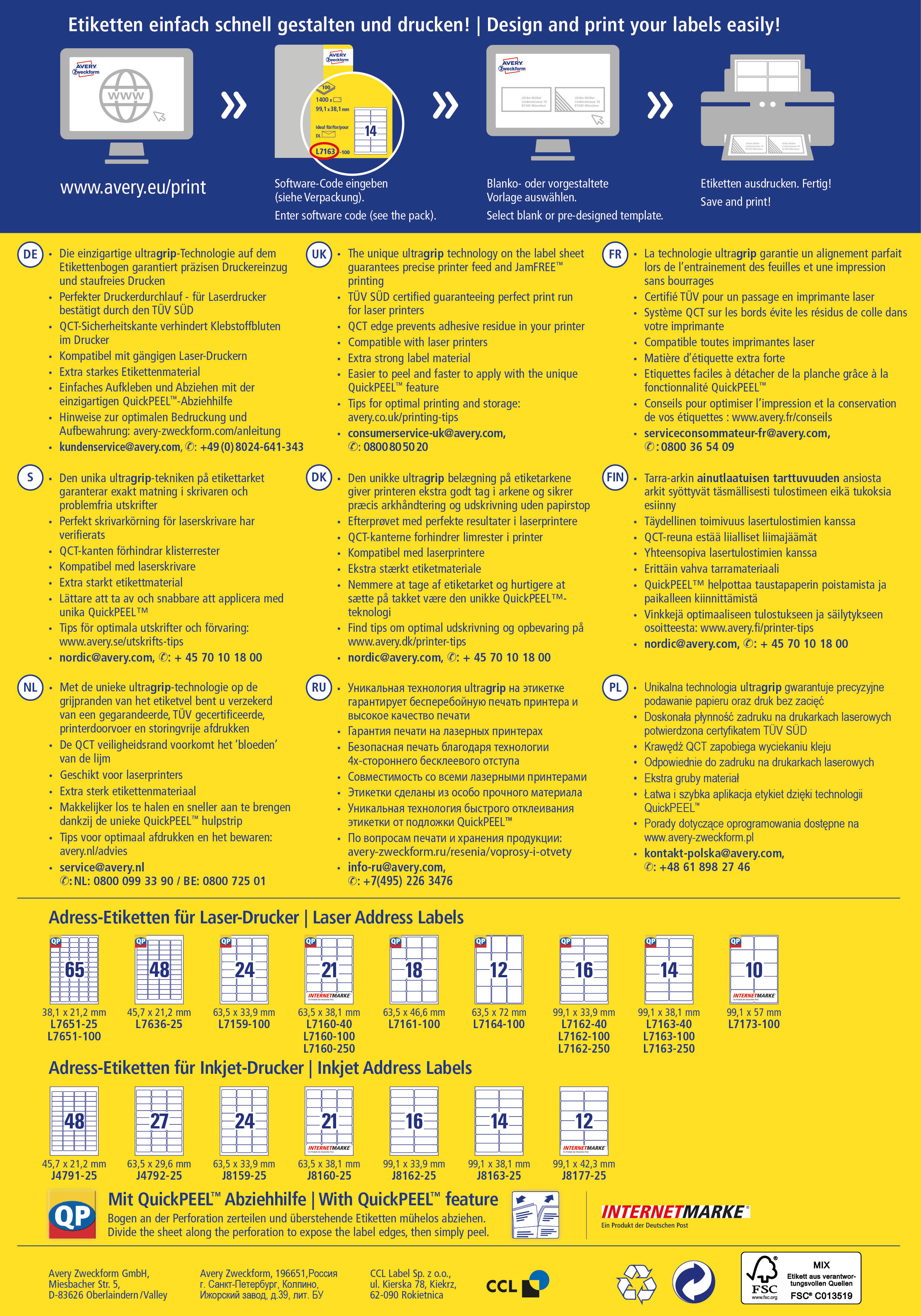 Dank der innovativen ultragrip-Technologie auf dem Etikettenbogen können Sie sich auf einen ultrapräzisen Druckereinzug und absolut staufreien Druckerdurchlauf verlassen. Die QCT-Sicherheitskante verhindert Klebstoffablagerungen im Drucker. Die Etiketten sind dank der QuickPEEL-Abziehhilfe einfach abzuziehen. Die Aufkleber haften zuverlässig auf Papier und Karton. Die Adressetiketten können auf allen gängigen Laserdruckern bedruckt werden und sind FSC-zertifiziert.