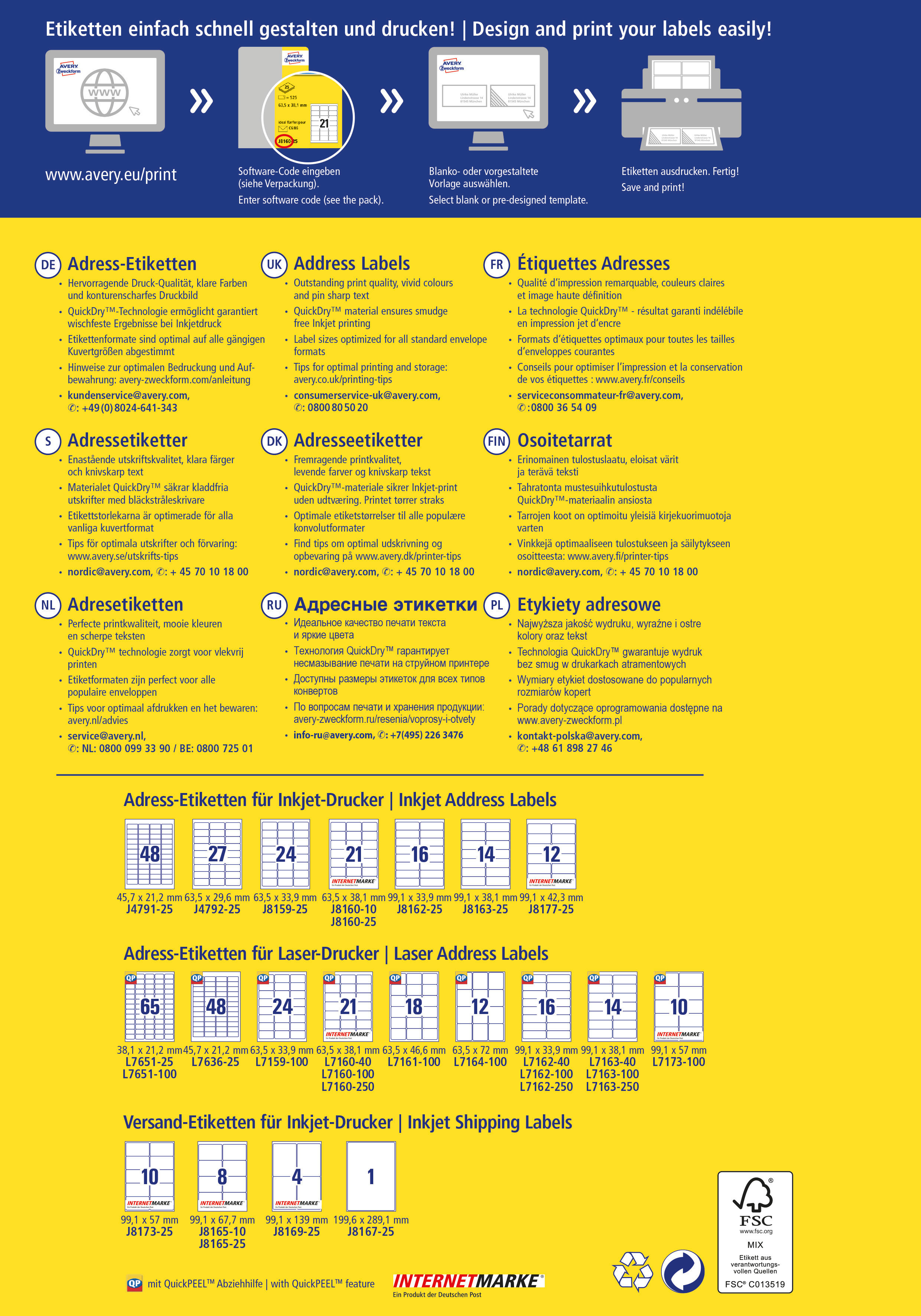 Qualität vom Etiketten-Experten: die weissen, spezialbeschichteten Adress-Etiketten J8159-25 für Inkjet-Drucker im Format 63,5 x 33,9 mm von Avery Zweckform sind optimal auf alle gängigen Kuvertgrössen abgestimmt und eignen sich z.B. zum Adressieren von C6 Kuverts. 600 Adress-Etiketten pro Packung auf 25 Bogen. Die spezielle QuickDry-Technologie garantiert wischfeste Ergebnisse, damit Sie für Ihre Aussendungen ein konturenscharfes Druckbild mit klaren Farben erhalten. Geeignet für alle gängigen Inkjet-Drucker. Ideen drucken – einfach & professionell: mit Etiketten von Avery Zweckform können Sie den kostenlosen Online Etiketten-Designer unter www.avery.eu/print nutzen. Gestalten Sie Ihr Etikett mit der Software komplett selbst, verwenden Sie eine der Design-Vorlagen zu zahlreichen Themen, die Sie individuell anpassen können oder laden Sie Ihr fertiges Design hoch und drucken anschliessend standgenau aus. So schnell und einfach sorgen Sie für einen professionellen Auftritt. Think & Care - Avery Zweckform ist seit 2020 klimaneutral: die Treibhausgasemissionen des Standortes werden durch zertifizierte Klimaschutzprojekte ausgeglichen. Schon seit 2014 wird ausschliesslich Ökostrom/-gas verwendet. Forschung, Entwicklung, Produktion, Logistik und Verwaltung am Firmenstandort in Oberlaindern/Bayern garantieren höchste Qualitäts- und Umweltstandards sowie kurze Lieferwege. Das Obermaterial dieser chlorfrei gebleichten Etiketten wird zu 100% aus FSC®-zertifiziertem Papier aus verantwortungsvoll bewirtschafteten Wäldern hergestellt.