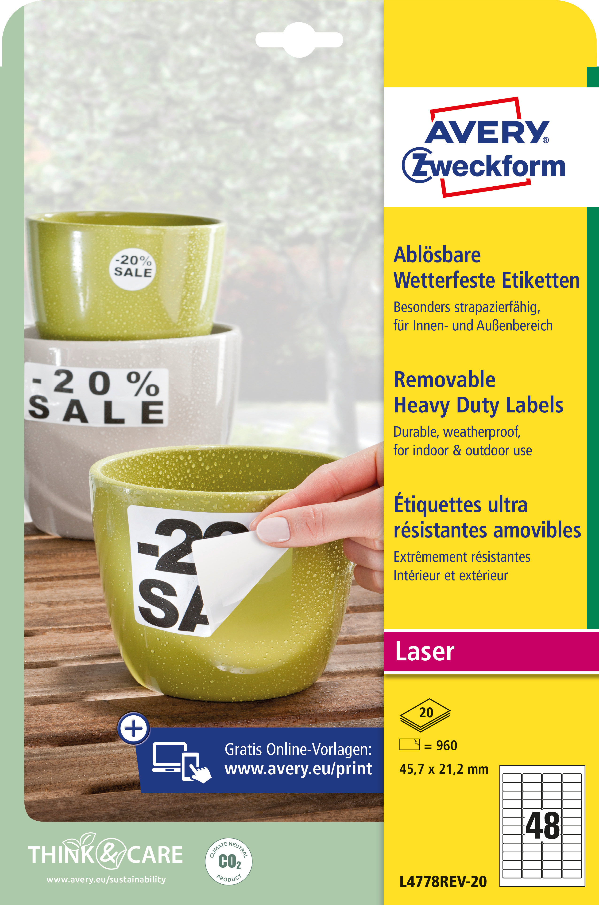 Qualität vom Etiketten-Experten: die ablösbaren, wetterfesten Etiketten L4778REV-20 im Format 45,7 x 21,2 mm für Laser-Drucker von Avery Zweckform zeichnen sich durch eine extreme Strapazierfähigkeit im Innen- und Aussenbereich aus. 960 matt beschichtete Folien-Etiketten aus Polyester auf 20 Bogen. Die Aufkleber haften sehr stark und sind dabei ablösbar, ohne Kleberückstände zu hinterlassen. Sie eignen sich dadurch besonders z.B. für die temporäre Kennzeichnung in Lager und Produktion, als Inventar- und Eigentums-Etiketten oder für Promotions und temporäre Produktbeschriftungen. Die reiss- und wasserfesten Folien-Etiketten sind deutlich strapazierfähiger als Papier-Etiketten, sie sind öl-, schmutz-, UV- und temperaturbeständig (-20° bis +80°C) und abwaschbar. Für alle gängigen Laser-Drucker geeignet. Ideen drucken - einfach & professionell: mit Etiketten von Avery Zweckform können Sie den kostenlosen Online Etiketten-Designer unter www.avery.eu/print nutzen. Gestalten Sie Ihr Etikett mit der Software komplett selbst, verwenden Sie eine der Design-Vorlagen zu zahlreichen Themen, die Sie individuell anpassen können oder laden Sie Ihr fertiges Design hoch und drucken anschliessend standgenau aus. So schnell und einfach sorgen Sie für einen professionellen Auftritt. Think & Care - Avery Zweckform ist seit 2020 klimaneutral: die Treibhausgasemissionen des Standortes werden durch zertifizierte Klimaschutzprojekte ausgeglichen. Schon seit 2014 wird ausschliesslich Ökostrom/-gas verwendet. Forschung, Entwicklung, Produktion, Logistik und Verwaltung am Firmenstandort in Oberlaindern/Bayern garantieren höchste Qualitäts- und Umweltstandards sowie kurze Lieferwege. Die Etiketten aus PVC-freier Folie werden klimaneutral hergestellt, die Emissionen des Materials werden kompensiert.