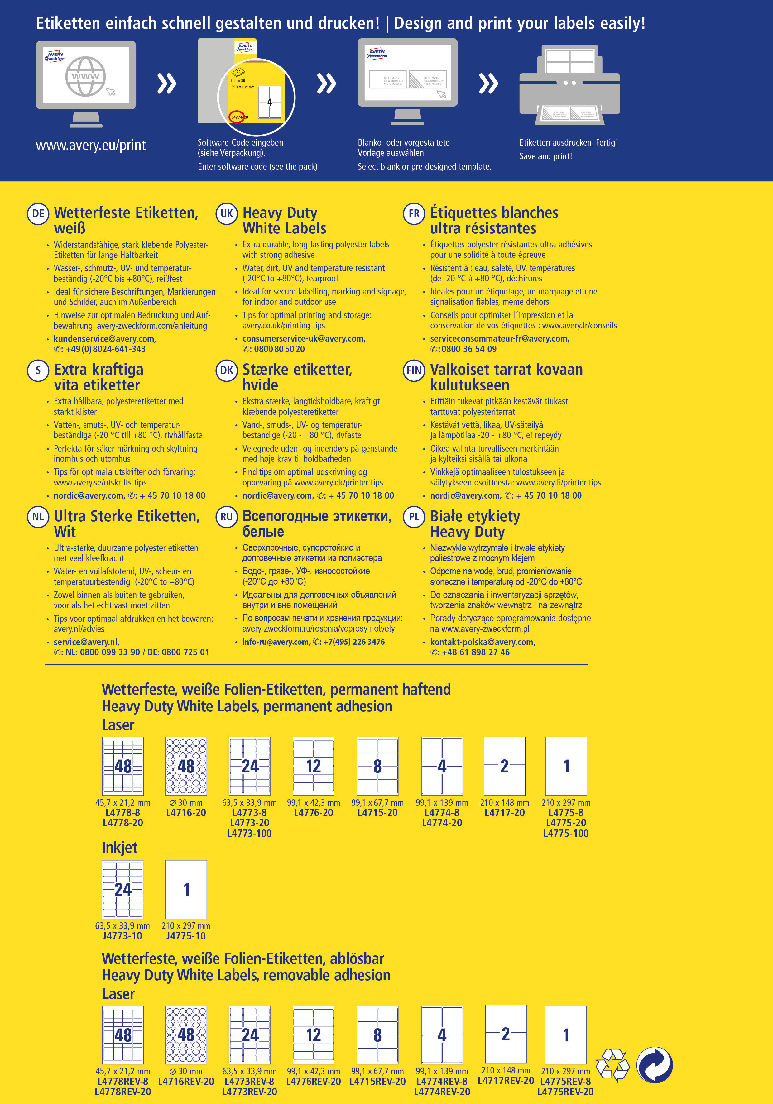 Qualität vom Etiketten-Experten: die weissen, wetterfesten Etiketten L4715-20 im Format 99,1 x 67,7 mm für Laser-Drucker von Avery Zweckform zeichnen sich durch eine extreme Strapazierfähigkeit im Innen- und Aussenbereich aus. 160 matt beschichtete Folien-Etiketten aus Polyester auf 20 Bogen. Durch die starke, permanente Haftung eignen sie sich besonders zur wetterfesten und dauerhaften Kennzeichnung. Die reiss- und wasserfesten Folien-Etiketten sind deutlich strapazierfähiger als Papier-Etiketten, öl-, schmutz-, UV- und temperaturbeständig (-20° bis +80°C), seewasserfest und abwaschbar. Für alle gängigen Laser-Drucker geeignet. Ideen drucken - einfach & professionell: mit Etiketten von Avery Zweckform können Sie den kostenlosen Online Etiketten-Designer unter www.avery.eu/print nutzen. Gestalten Sie Ihr Etikett mit der Software komplett selbst, verwenden Sie eine der Design-Vorlagen zu zahlreichen Themen, die Sie individuell anpassen können oder laden Sie Ihr fertiges Design hoch und drucken anschliessend standgenau aus. So schnell und einfach sorgen Sie für einen professionellen Auftritt. Think & Care - Avery Zweckform ist seit 2020 klimaneutral: die Treibhausgasemissionen des Standortes werden durch zertifizierte Klimaschutzprojekte ausgeglichen. Schon seit 2014 wird ausschliesslich Ökostrom/-gas verwendet. Forschung, Entwicklung, Produktion, Logistik und Verwaltung am Firmenstandort in Oberlaindern/Bayern garantieren höchste Qualitäts- und Umweltstandards sowie kurze Lieferwege. Die Etiketten aus PVC-freier Folie werden klimaneutral hergestellt, die Emissionen des Materials werden kompensiert.