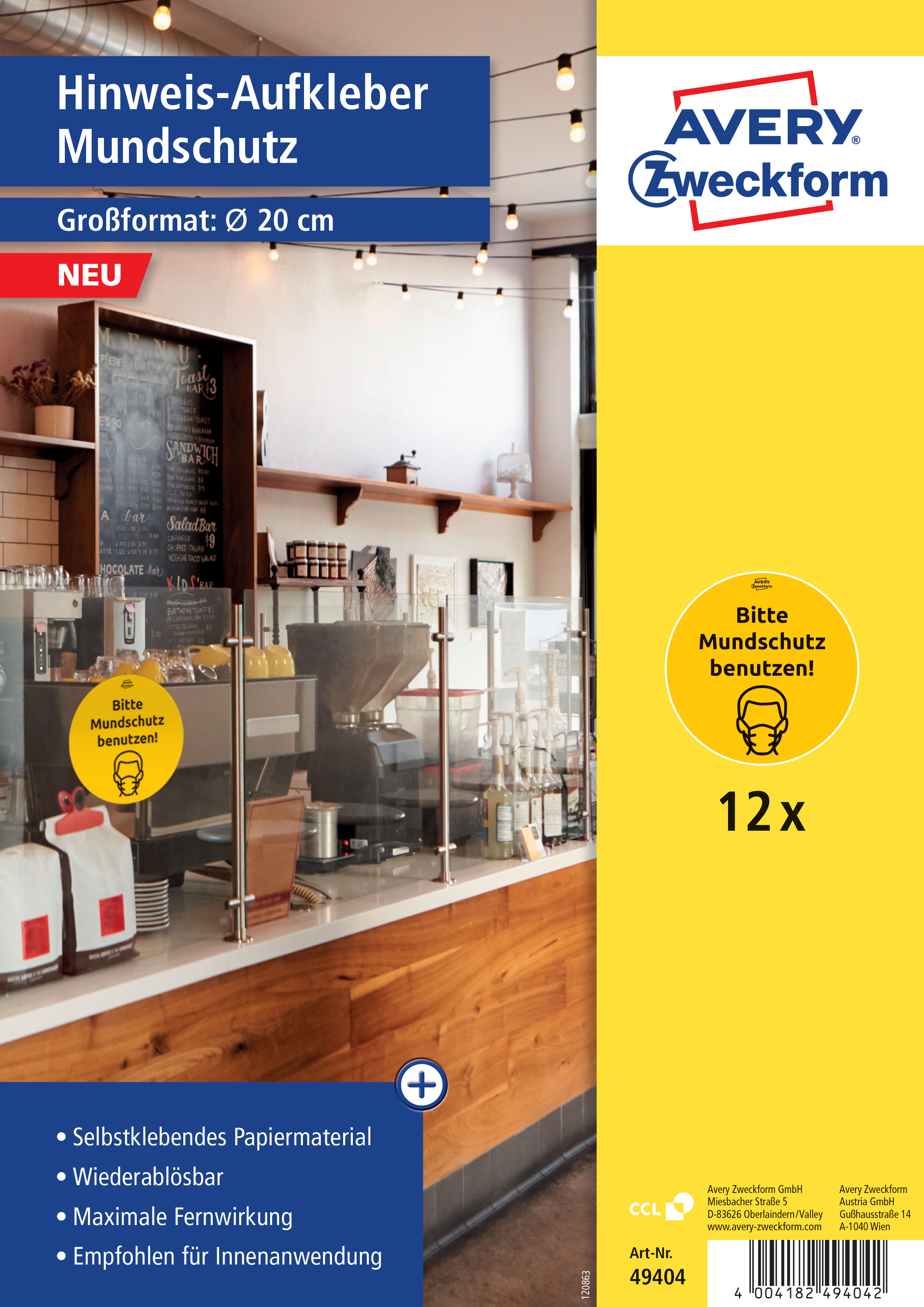 AVERY ZWECKFORM Hinweis-Aufkleber DE 20cm 49404 Mundschutz 12 Stück