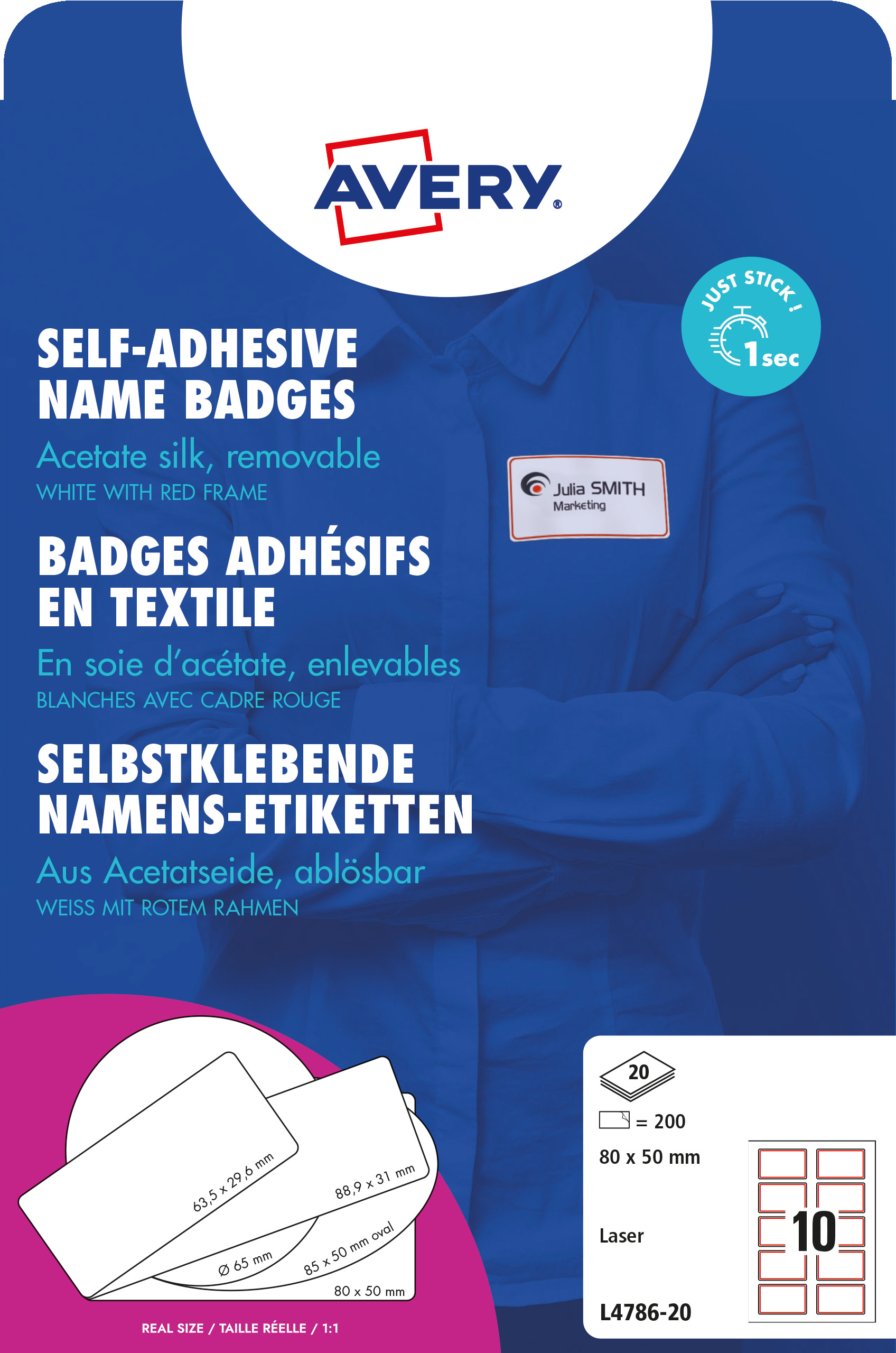 Qualität vom Etiketten-Experten: die selbstklebenden, ablösbaren Namens-Etiketten L4786-20 für Laser-Drucker von Avery Zweckform im Format 80 x 50 mm erleichtern Ihnen die Organisation von Veranstaltungen, Seminaren und Konferenzen. 200 weisse Textil-Etiketten mit rotem Rand auf 20 Bogen. Die rechteckigen Namensschilder sind die perfekte Alternative zu Plastikschildern mit Nadel oder Clip. Die Namensschilder aus Acetatseide haften zuverlässig auf Kleidung und Textilien und lassen sich rückstandsfrei wieder ablösen. Die Rückseiten-Stanzung der Namensschilder erlaubt das einfache Heraustrennen der Namens-Etiketten samt Trägerfolie für eine spätere Verwendung. Die Textil-Etiketten sind nicht geeignet für Leder, Seide, Samt und andere empfindliche Textilien. Die Namens-Etiketten bieten einen garantiert staufreien Druckerdurchlauf auf allen gängigen Laser-Druckern. So arbeiten Sie effizient wie stressfrei und schaffen sich wertvolle Zeit für die wirklich wichtigen Dinge. Ideen drucken - einfach & professionell: mit Etiketten von Avery Zweckform können Sie den kostenlosen Online Etiketten-Designer unter www.avery.eu/print nutzen. Gestalten Sie Ihr Etikett mit der Software komplett selbst, verwenden Sie eine der Design-Vorlagen zu zahlreichen Themen, die Sie individuell anpassen können oder laden Sie Ihr fertiges Design hoch und drucken anschliessend standgenau aus. So schnell und einfach sorgen Sie für einen professionellen Auftritt. Think & Care - Avery Zweckform ist seit 2020 klimaneutral: die Treibhausgasemissionen des Standortes werden durch zertifizierte Klimaschutzprojekte ausgeglichen. Schon seit 2014 wird ausschliesslich Ökostrom/-gas verwendet. Forschung, Entwicklung, Produktion, Logistik und Verwaltung am Firmenstandort in Oberlaindern/Bayern garantieren höchste Qualitäts- und Umweltstandards sowie kurze Lieferwege. Die Etiketten aus PVC-freier Acetatseide werden klimaneutral hergestellt, die Emissionen des Materials werden kompensiert. Made in Germany.