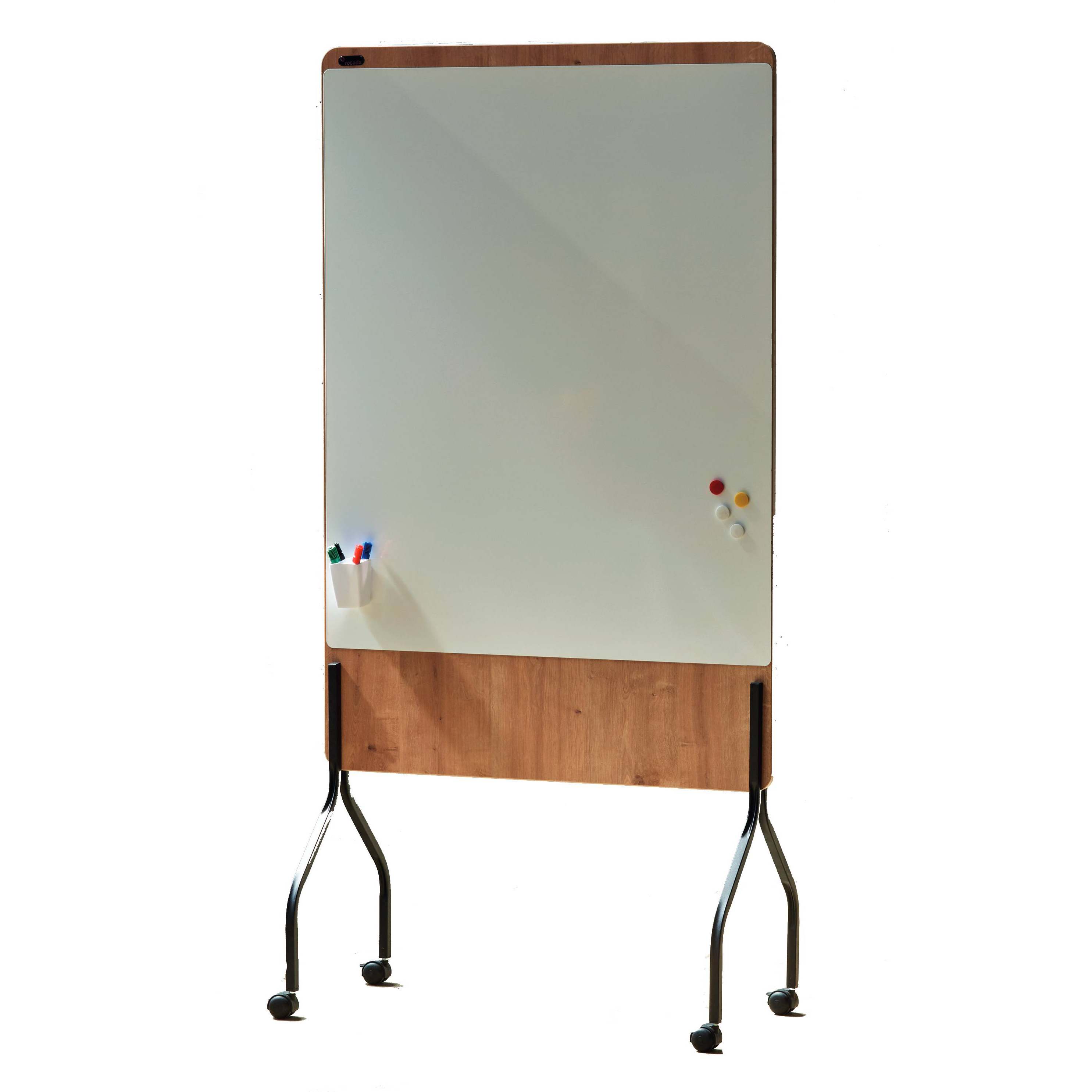 Das Kombiboard ist beidseitig magnethaftend, beschriftbar und trocken abwischbar. Rahmen in Holzoptik auf einem mobilen Stativ aus robustem Stahl mit 4 feststellbaren Rollen.