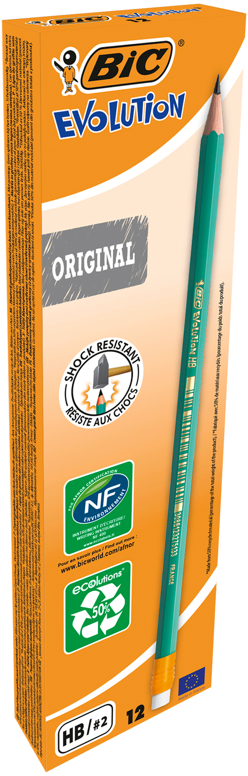 Bleistift BiC Evolution® Original NF mit Graphitmine HB N°2, Holzfreier, ökologischer Bleistift, bis zu 57% aus recyceltem Material hergestellt. Mit Öko-Label NF400 Environnement. Der schmale, sechskantige, grüne Schaft, Ø 6.3mm, L 17.5 cm, hat eine bissfeste Oberfläche, ist biegsam und schockresistent, daher keine Splittergefahr. Leicht zu spitzen. Solide Graphitmine 2.3 mm in hochwertiger BiC-Qualität, mit ausgezeichneter Ausradierbarkeit.