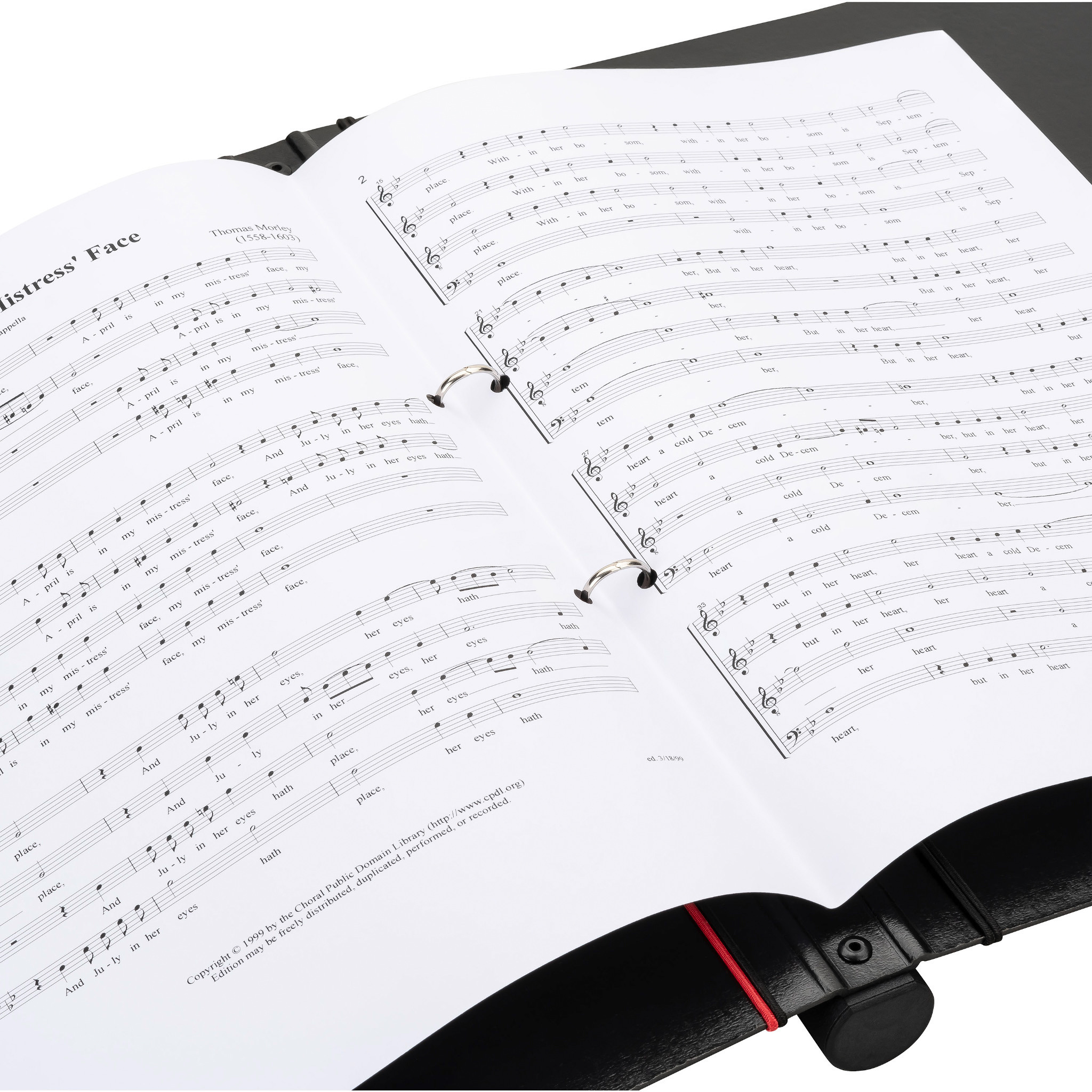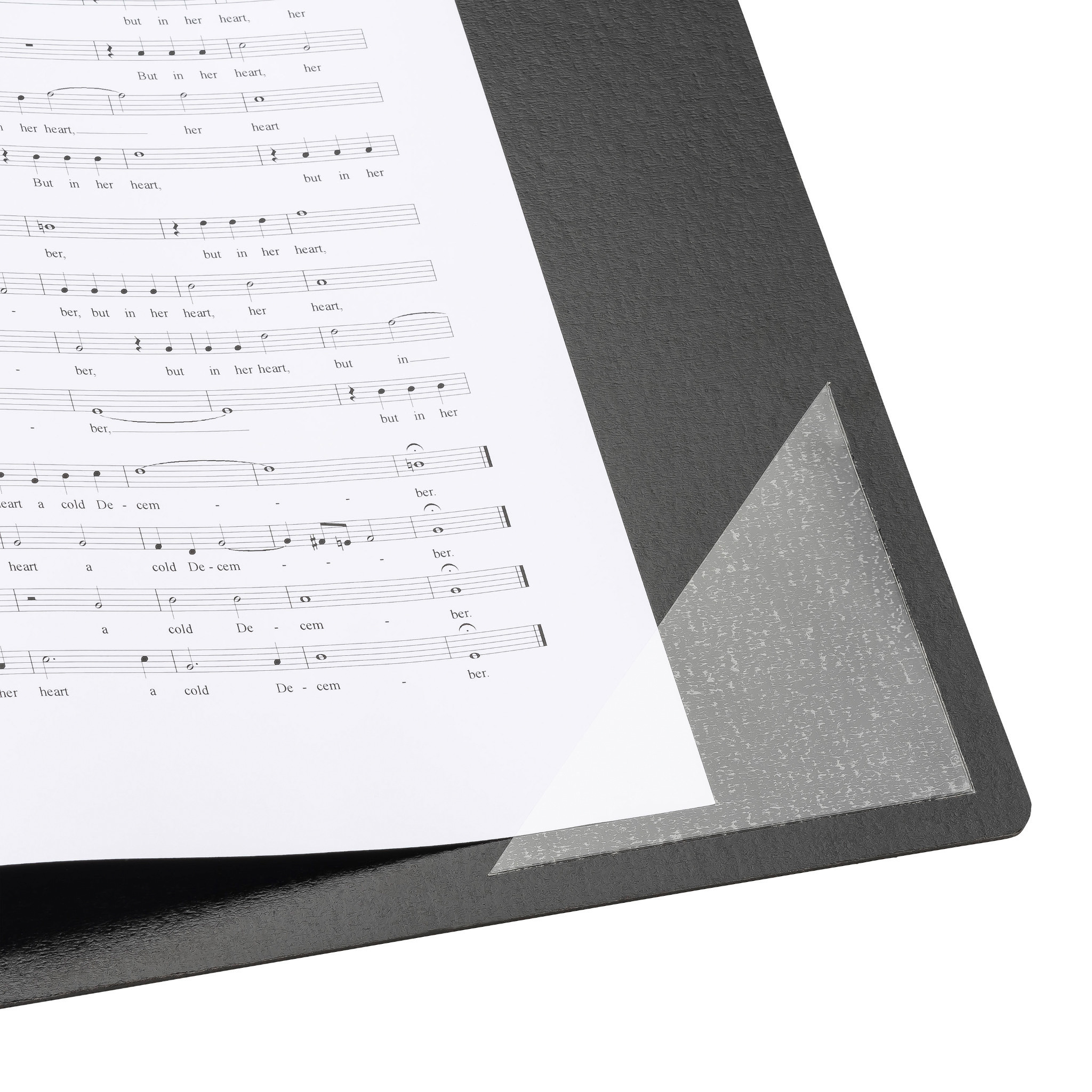 Chormappe aus hochwertiger schwarzer Pappe mit eleganter Nadelstreifenprägung aussen. Mit ergonomischem Haltegriff an der Rückseite und einer 2 Ring Mechanik sowie 4 Verschluss- und Haltegummis zur Sicherung der Notenblätter. Innen mit zwei Kunststofftaschen an den unteren Ecken, 360g leicht, FSC® zertifiziert ISBN 978-3-00-080949-1.