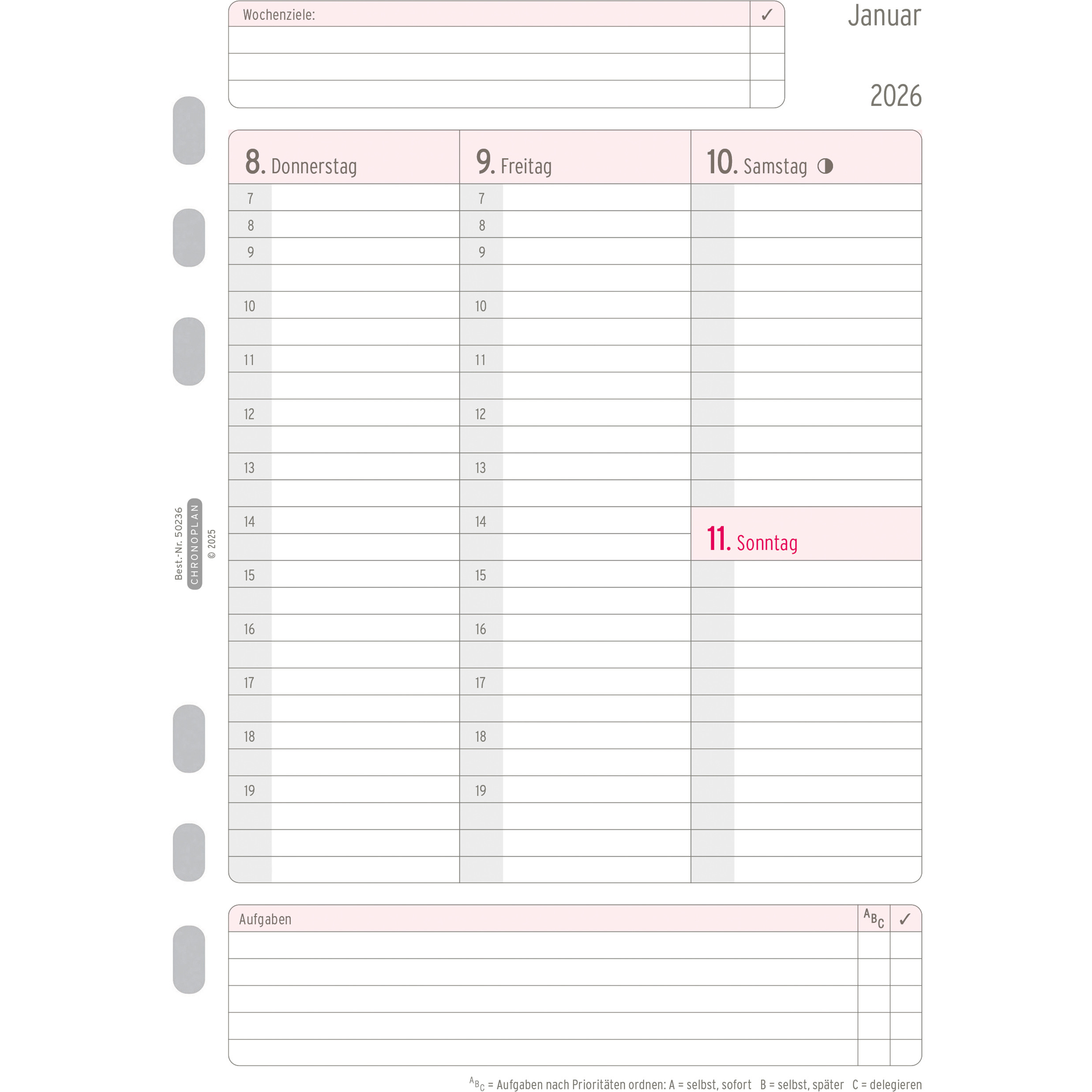 Mit dem CHRONOPLAN Wochenplan 2026 im A5 Format für Ihren Terminplaner behalten Sie die Übersicht über Ihre Termine und Aufgaben. Diese Kalendereinlage ermöglicht ein effizientes und übersichtliches Zeitmanagement mit einer Woche auf 2 Seiten. Die Tage si