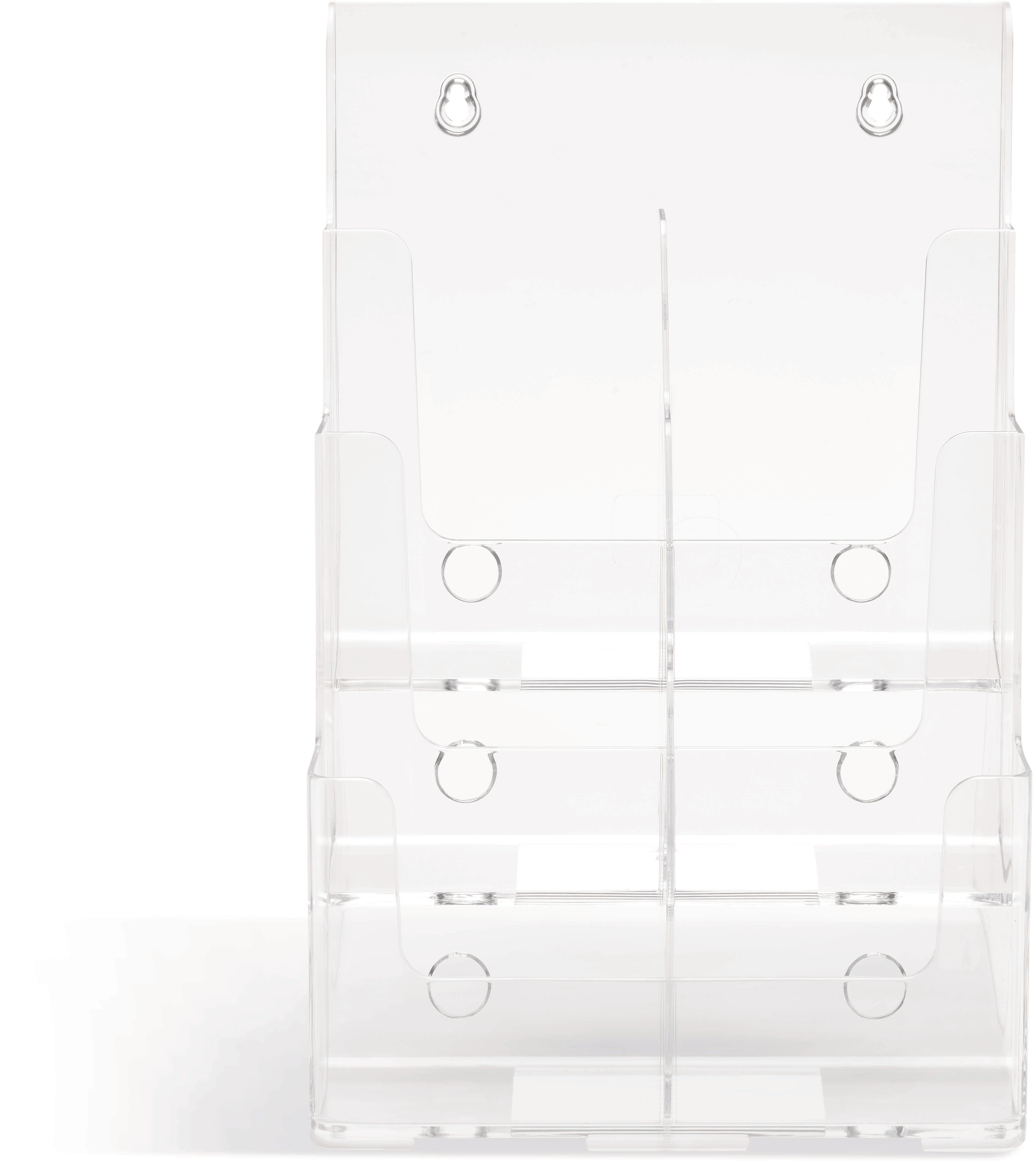 Mehrstufiger Prospekthalter für eine Vielzahl von Prospekten, spart wertvolle Standfläche. Abgeschrägt, für eine stabile Präsentation. So haben Sie Prospekte und Kataloge glasklar im Blickfeld. Wandmontage ebenfalls möglich. Material: Polystyrol. Grösse: DIN lang Hochformat, 2 x 3 Stufen, 245 x 322 x 195 mm (B x H x T).
