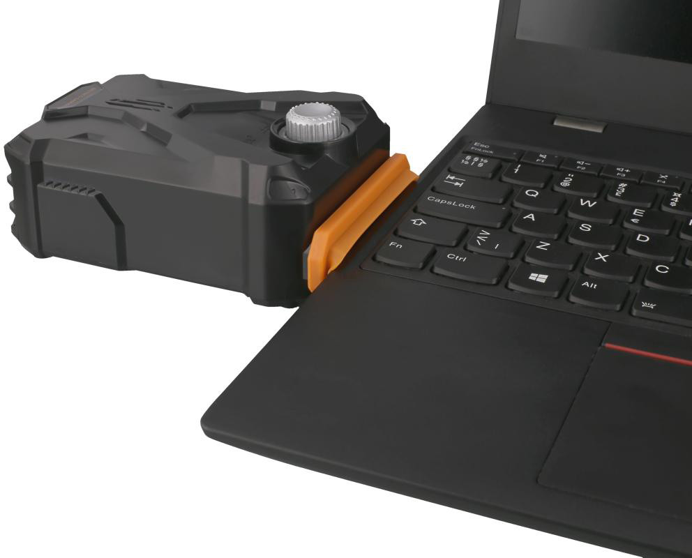 Laptop-Kühler, der an den Luftauslass deines Gaming-Laptops angeschlossen wird. Er wird über ein USB-Stromkabel mit Strom versorgt. Auf der Oberseite befindet sich ein silberner Knopf, der den Luftstrom des Kühlers steuert. Dieser Kühler funktioniert an den meisten Laptops, unabhängig davon, ob sich der Luftauslass Ihres Laptops auf der linken/rechten Seite oder auf der Rückseite befindet. Er wird jedoch nicht für Laptops empfohlen, die dünner als 10 mm sind.