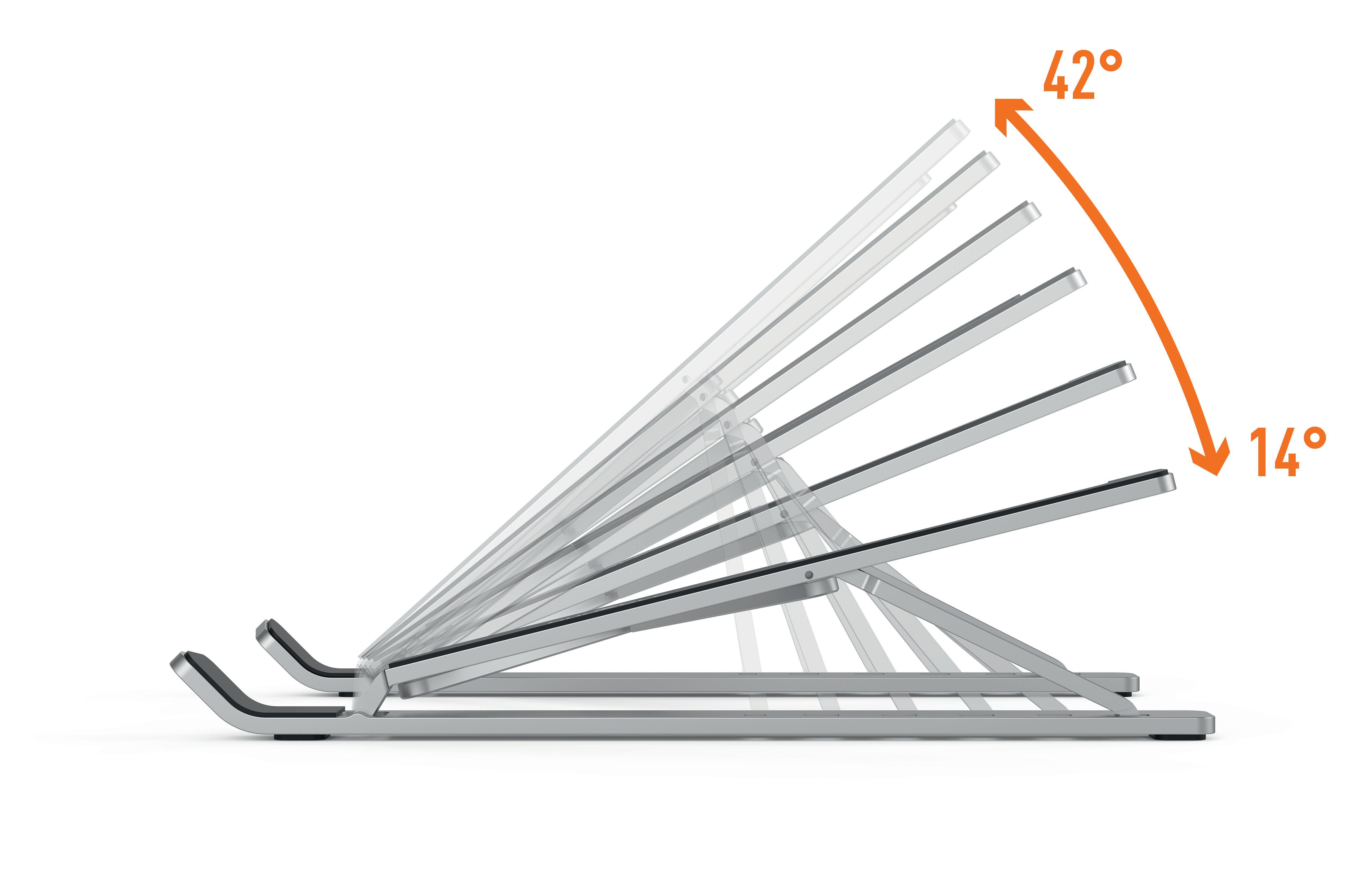 Universell verstellbare Tisch Halterung für Laptops und Tablets bis 15“. Platzsparend zusammenfaltbar und mobil. Höhenverstellbar in 6-Stufen für Ergonomie und Komfort. Erleichtert das ergonomische Arbeiten durch flexible Höhen- und Lesewinkeleinstellung. Ermöglicht die Nutzung von Laptops als Desktopbildschirm (in Kombination mit externer Tastatur & Maus). Rutschfeste Gummiauflagen schützen vor Kratzern. Verbesserte Wärmeableitung. Inkl. Praktischer Transportbeutel. Maximale Belastbarkeit: 10 kg.