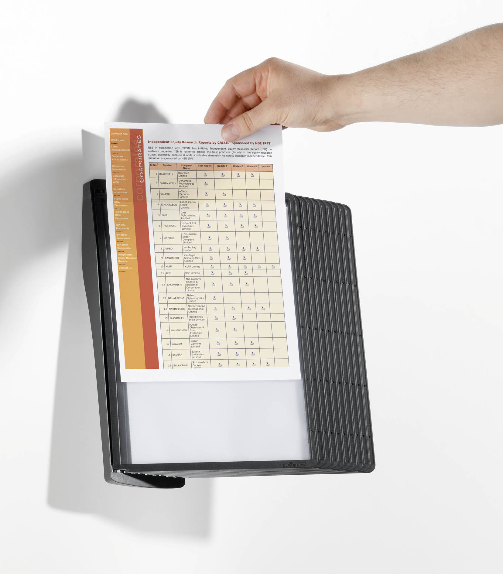 Wandhalter mit 10 SHERPA PANEL Sichttafeln im Format A4 für Preis- und Telefonlisten, Katalogseiten, Fotos etc., die reflexionsarmen Tafeln, sind dokumentenecht und scannertauglich, inkl. Reitern mit blanko Einsteckschildern. Einfache Befestigung. 5 Jahre Garantie.