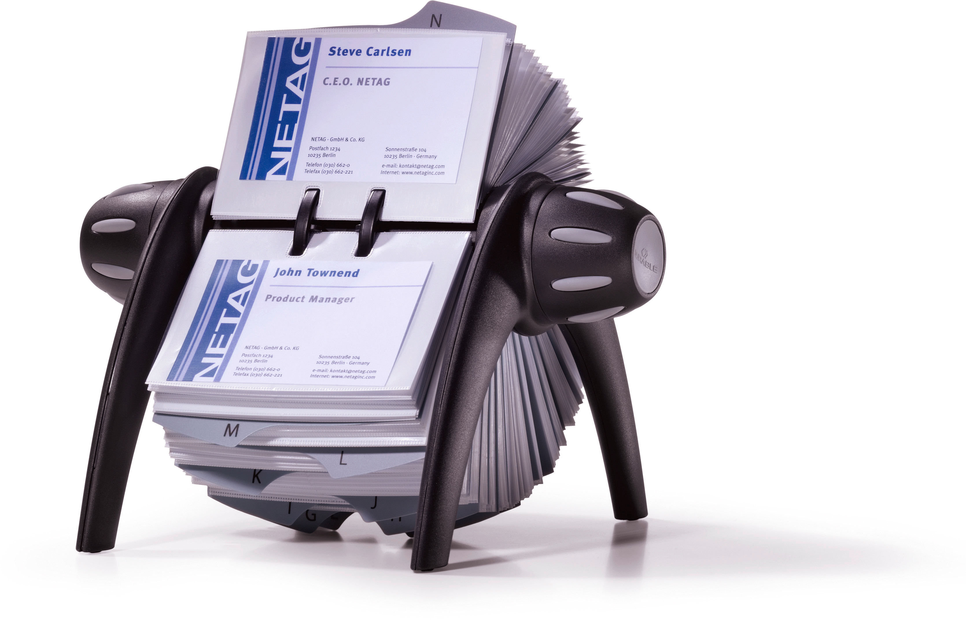 Rotationskartei für die Archivierung von Visitenkarten. Aus hochwertigem Kunststoff in exklusivem Design. Mit 200 Visitenkartenhüllen im Format 72 x 104 mm, beidseitig nutzbar, für 400 Visitenkarten. Alphabetisches, 25-teiliges Register von A–Z. Rationelles Bestücken der Hüllen mit Visitenkarten durch leichtes Entnehmen und Einstecken der Visitenkartenhüllen.