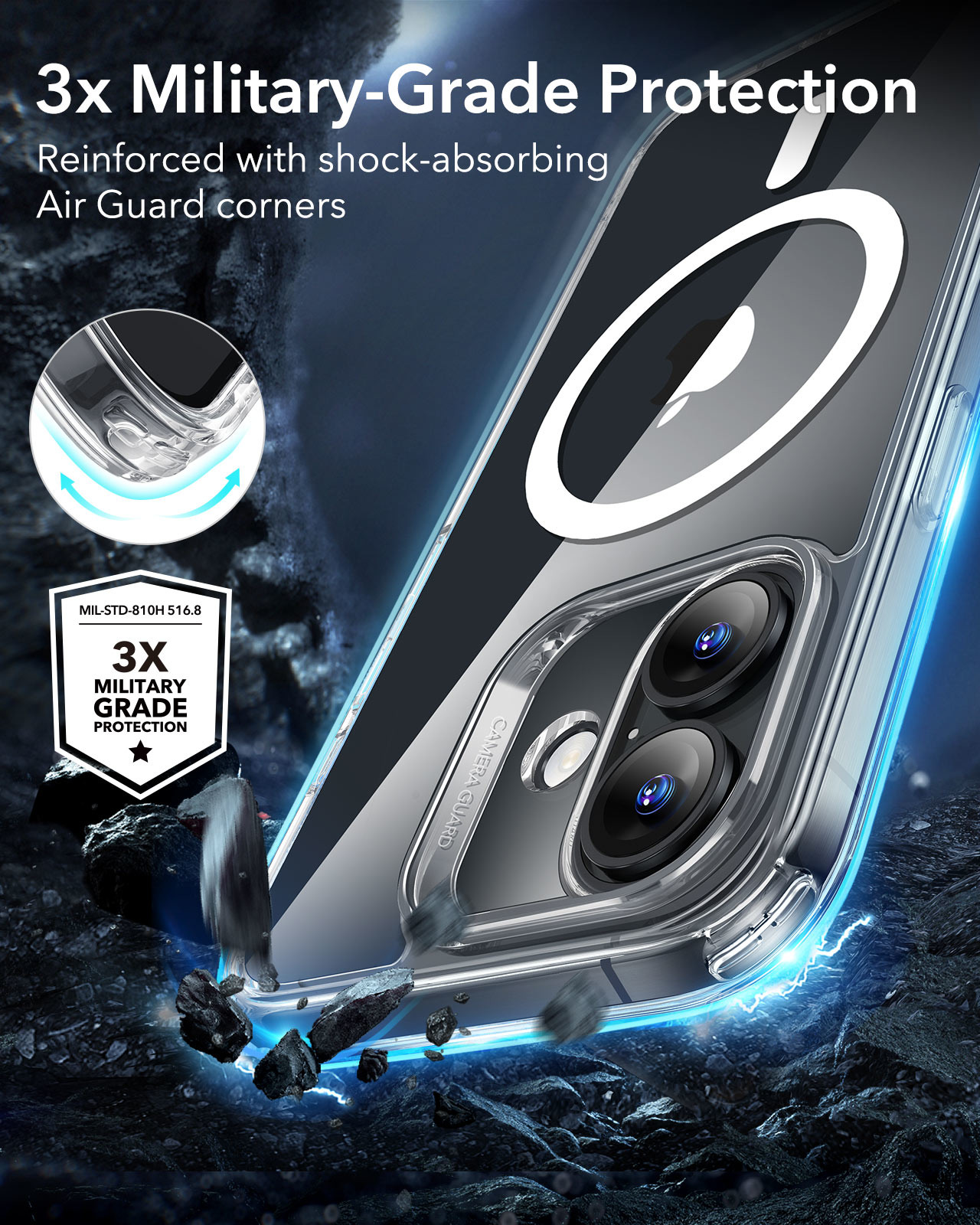 - Sturzschutz nach Militärstandard: Strengste Tests gewährleisten einen umfassenden Schutz auf allen Seiten, mit speziell entwickelten Air Guard-Ecken, die Stöße absorbieren