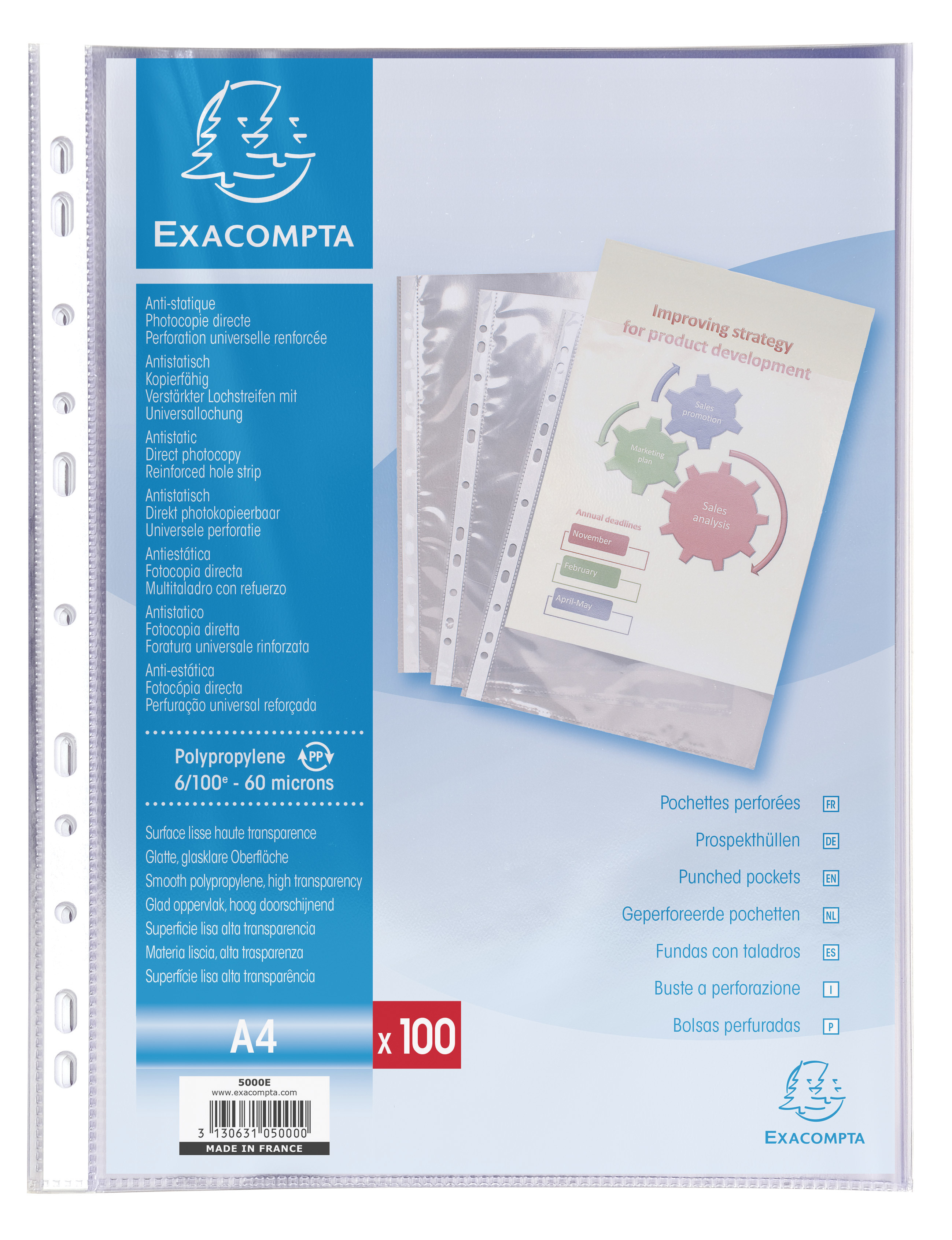 Packung mit 100 Zeigetaschen glatt und gelocht aus PP 60µ, DIN A4 Glatte Oberfläche, höchste Transparenz. Für eine schöne Präsentation Ihrer Dokumente. Öffnung oben.