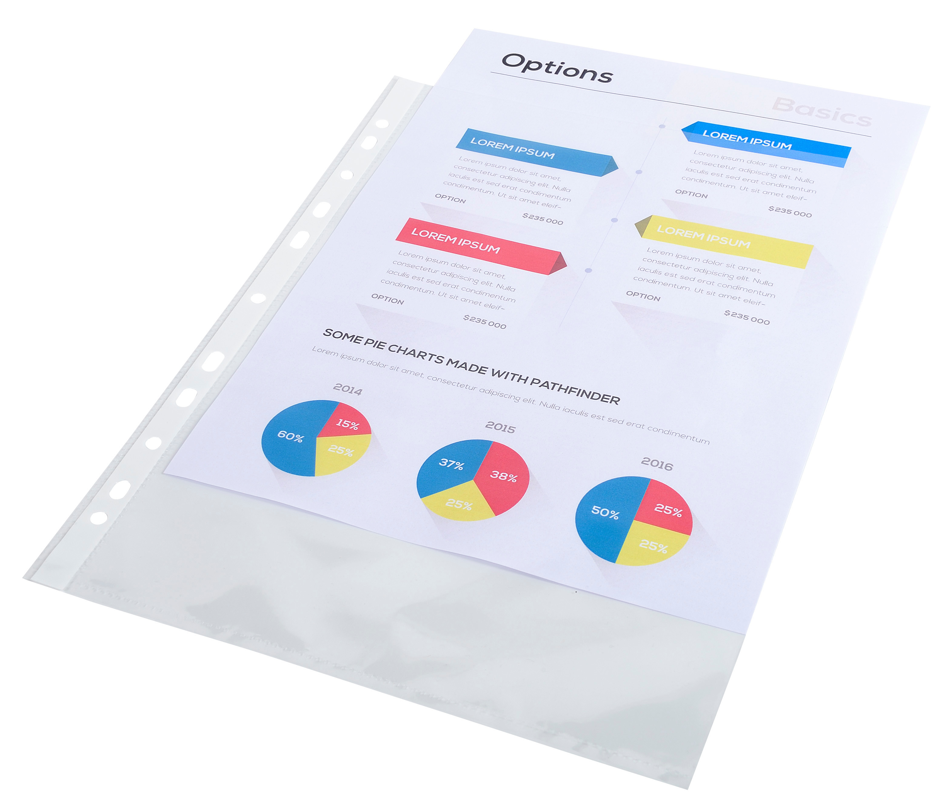 Packung mit 100 Zeigetaschen glatt und gelocht aus PP 60µ, DIN A4 Glatte Oberfläche, höchste Transparenz. Für eine schöne Präsentation Ihrer Dokumente. Öffnung oben.