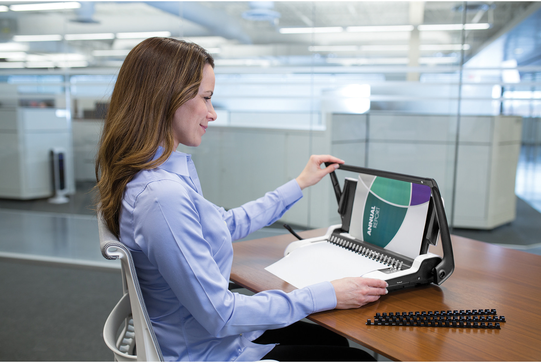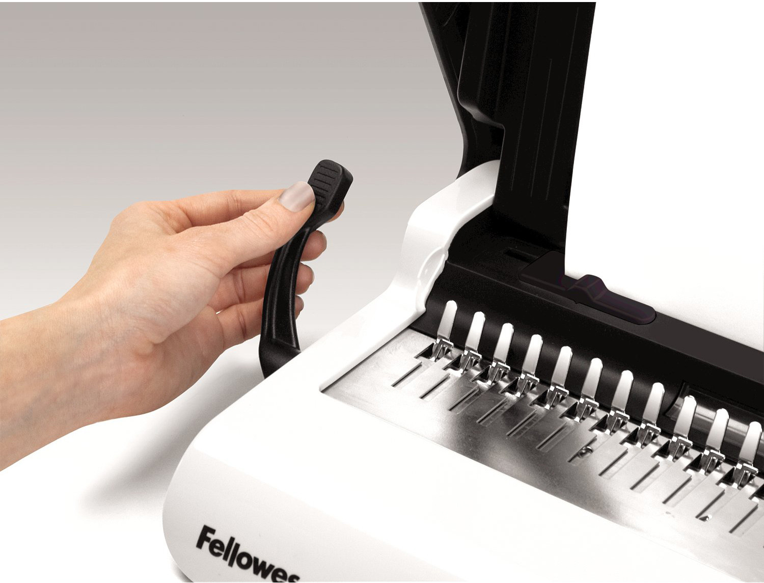 Stanzkapazität 15 Blatt (80g/m² Papier), Bindekapazität 150 Blatt mit max. 19mm Plastikbinderücken, müheloses manuelles Stanzen dank durchgängigem Stanzhebel, angewinkelter Kammträger erleichtert das Einlegen der Blätter, einstellbarer Schieber-Randanschlag zur genauen Ausrichtung des Papiers, Aufbewahrungsfach mit patentierter Dokument- und Binderückenmessfunktion zur schnellen Auswahl des passenden Binderückens, Stanzrestefach öffnet sich automatisch wenn voll, Masse: 8 x 45 x 28 cm.