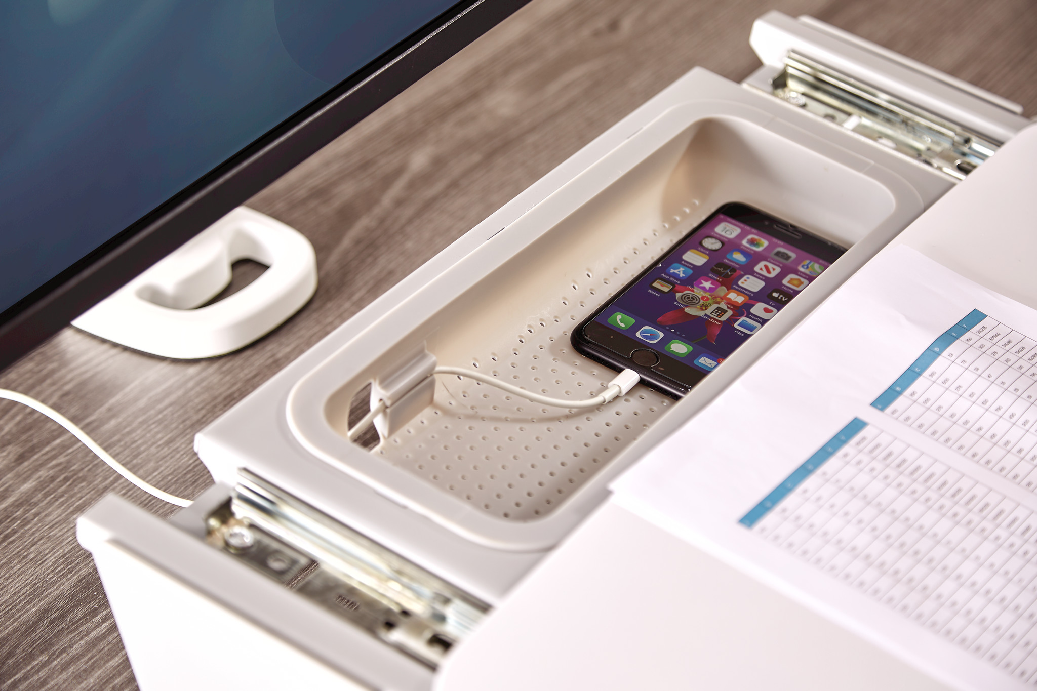 - Versteckte Zubehörschublade mit Ladezugang für Mobilgeräte