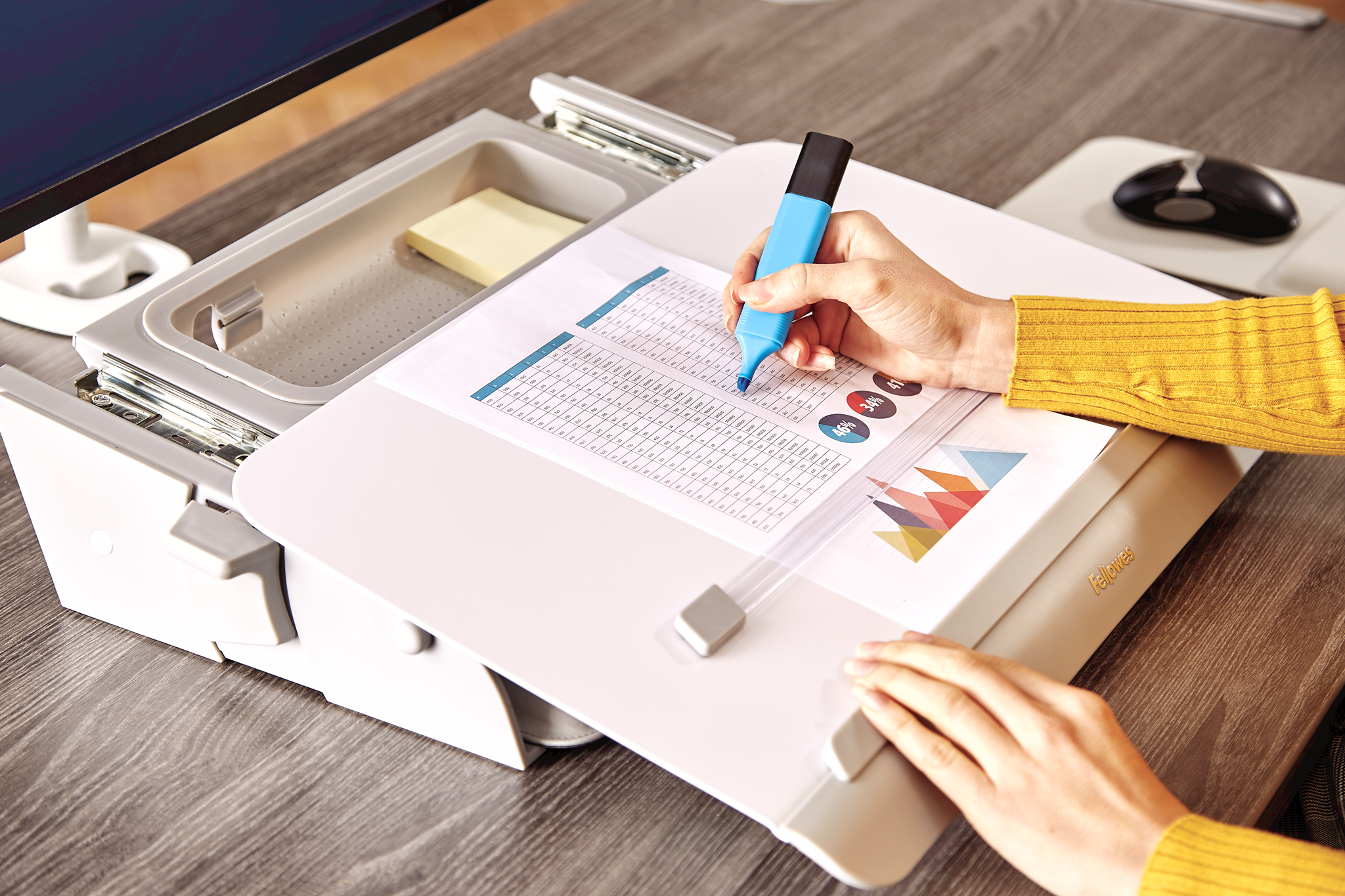 - Plattform gleitet nach vorne, wodurch die Tischfläche maximiert und ein ergonomischer Schreibbereich geschaffen wird