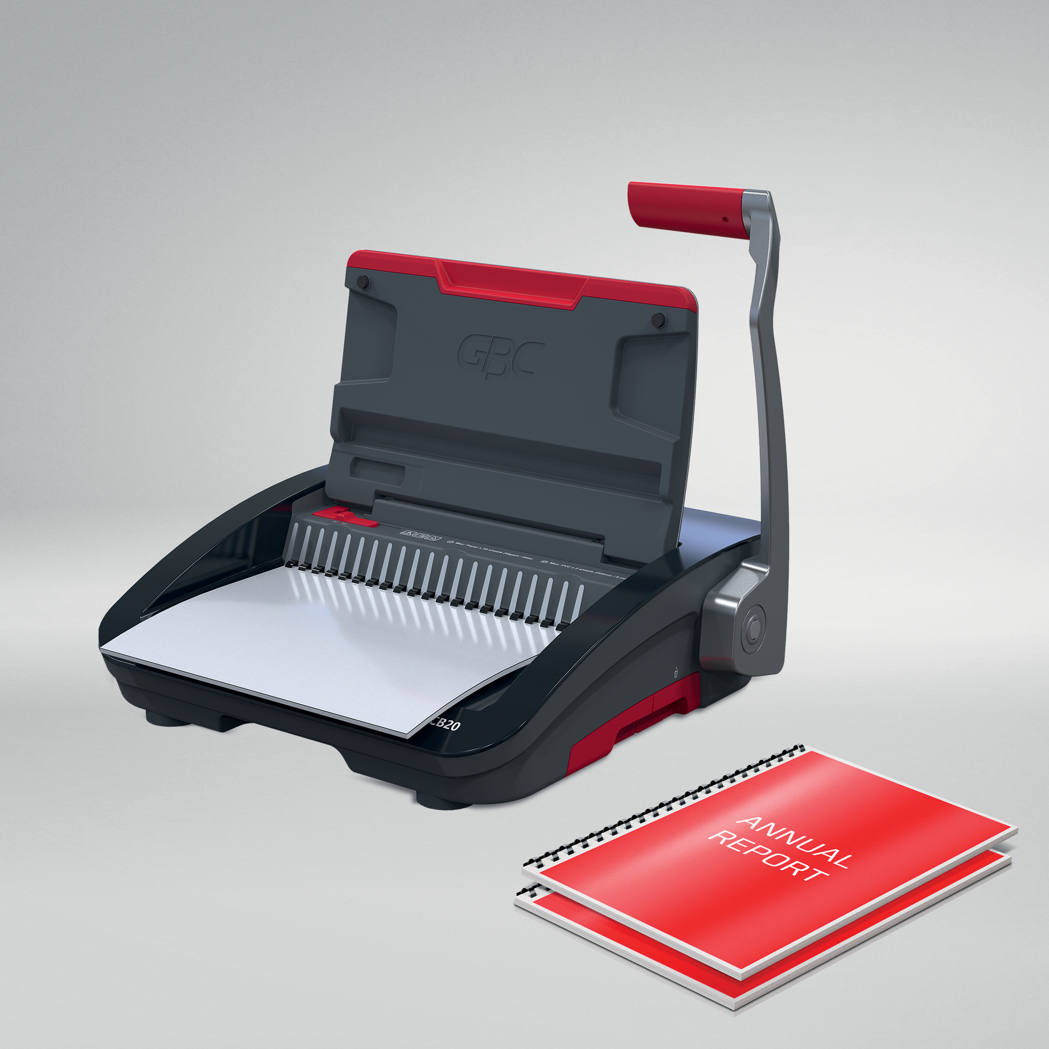 Der CombBind® CB20 ist ein zuverlässiges und kompaktes manuelles Plastikbindegerät für den Einsatz in z.B. Büro- und Schulumgebungen mit mittlerem Volumenbedarf. Es kann bis zu 20 Blatt 80-g/m²-Papier stanzen und mit 28-mm-Binderücken bis zu 240 Blätter gleichzeitig effizient binden. Durch sein leichtes, platzsparendes Design kann er jederzeit und überall verwendet und bei Nichtgebrauch einfach verstaut werden. Für zusätzlichen Komfort verfügt es über eine Auffangschale für die einfache Entsorgung des Schnittguts und ein Aufbewahrungsfach. Verbessern Sie Ihr Dokumentenmanagement mit dem GBC CB20 – hier trifft Funktionalität auf Stil. Mit einem GBC CombBind 20 lassen sich eine Vielzahl von Dokumenten professionell erstellen, darunter Berichte, Präsentationen, Handbücher, Abschlussarbeiten, Notizbücher, Fotobücher, Rezeptbücher und Kalender. Dieses Gerät ist auch ideal für die hochwertige Erstellung von Geschäftsdokumente, Schulungshandbücher, technischen Dokumentationen und kreativen Projekten geeignet. Farbe: Schwarz, Rot und Silber. Verwenden Sie GBC Originalzubehör für ein optimales Ergebnis: GBC CombBind™ Plastikbinderücken A4 12 mm, 100 Stück (Art. Nr. 4028177), GBC LeatherGrain™ Rückkarton Schwarz A4 250 g/m², 100 Stück (Art. Nr. CE040010), & GBC HiClear™ glasklares Deckblatt A4 200 Mikron, 100 Stück (Art. Nr. CE012080E)