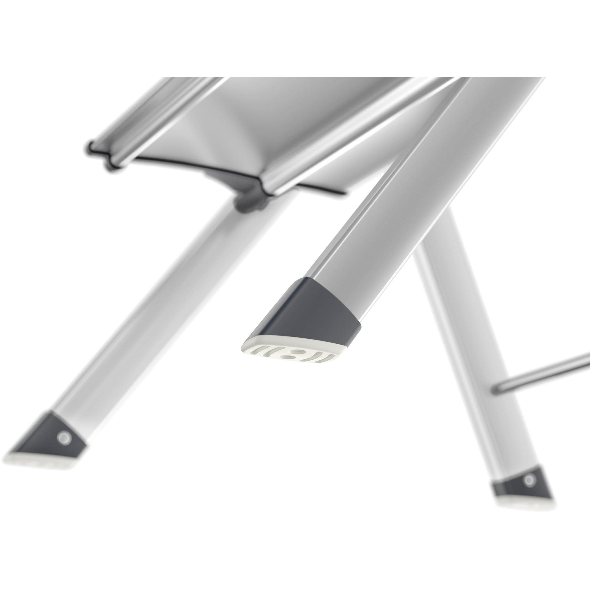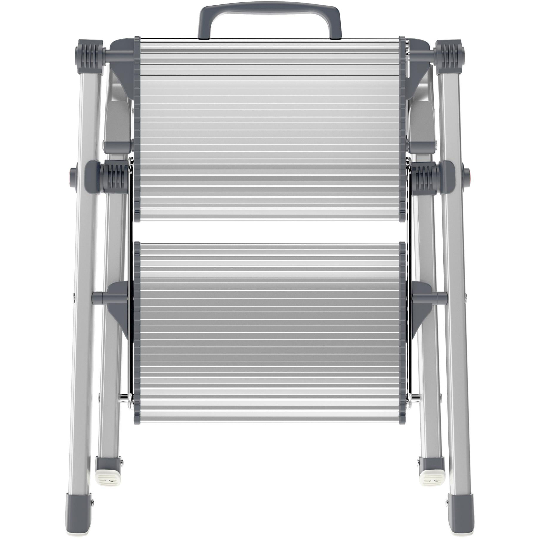 Belastbar mit bis zu 150 kg, Zwei grosse Aluminium-Stufen mit Anti-Rutsch-Riffelung für optimalen Steh-Komfort, Einfach zu verstauen: zusammengeklappt nur 6,5 cm breit, Tragegriff mit integrierter Entriegelungsfunktion, Fuss mit Soft-Grip-Sohle für optimale Rutschsicherheit auf Parkett, Teppichböden und FliesenHöhe: 45 cm • Belastbarkeit: 150 kg • Produkttyp: Trittleiter • Anzahl Stufen: 2 x
