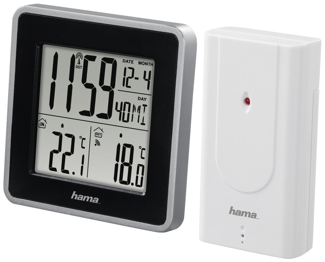 Hama Wetterstation EWS Intro für die Anzeige von Temperatur, Zeit, Datum und Wochentag • Batteriekapazitätsanzeige • Anzeige von Innen- und Aussentemperatur • umschaltbar zwischen °C und °F • Speicherung der max. und min. Temperaturen innerhalb eines Tages • Trendanzeige der Temperatur • Uhr-/Kalender-/Weckfunktion • Uhrzeit umschaltbar zwischen 12- und 24-Stunden-Format • Wochentagsanzeige einstellbar in Englisch, Deutsch, Französisch, Spanisch und Italienisch • Anzeige des Datums • Alarm- und Schlummerfunktion • Lieferumfang: Wetterstation, Sensor, 4x Batterien AA, Bedienungsanleitung