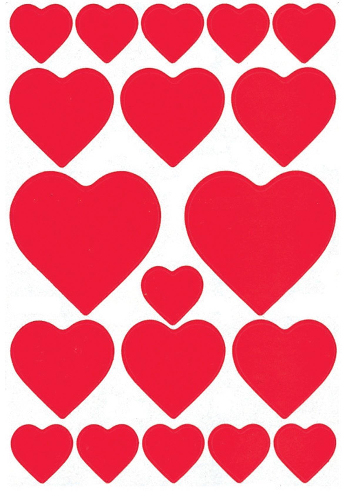 Diese roten Herzen dürfen in keiner Liebeserklärung fehlen. Ihr schlichtes Design und die kräftige Farbe lassen Herzen höher schlagen, weshalb sie optimal zur Verzierung von liebevollen Briefen, Einladungen und süsse Botschaften verwendet werden können. Das knallige Rot ist ein richtiger Eyecatcher und wirkt besonders gut auf einfarbigen Hintergründen. Die Schmucketiketten sind aus Papier angefertigt und verfügen über selbstklebende und permanent haftende Eigenschaften. Deshalb halten sie besonders gut auf fettfreien, glatten Oberflächen und können individuell aufgeklebt werden. Damit Sie sich oft und besonders lange an den tollen Stickern erfreuen können, sind in einer Verpackung 3 Blatt mit 54 Stickern enthalten. Die enthaltenden Herzen haben unterschiedliche Grössen