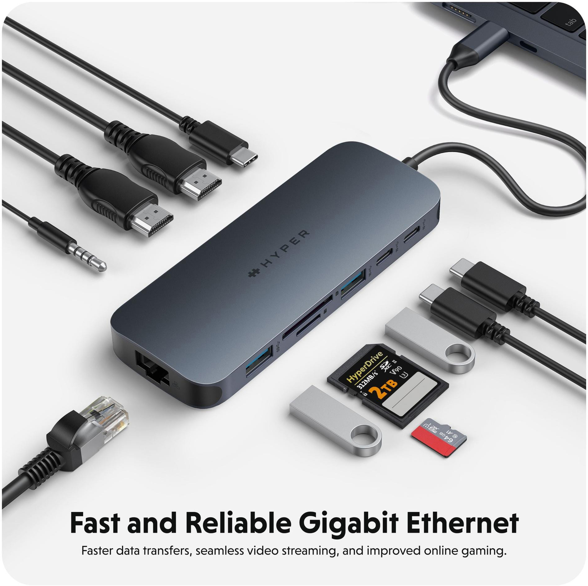 Wir stellen den HyperDrive® Next 11 Port USB-C Hub vor - die ultimative Konnektivitätslösung für Kreative, Redakteure, Fotografen und mehr. Mit Unterstützung für zwei 4K 60 Hz Monitore* für PC und Chromebook™, 11 ultraschnellen Anschlüssen und blitzschnellen Datenübertragungen können Sie Ihr kreatives Potenzial überall entfesseln. Erleben Sie 2-mal schnellere Dateiübertragungen mit den 10-Gbit/s-USB-Anschlüssen und 3-mal schnellere Foto- und Videoübertragungen mit microSD und SD 4.0. Profitieren Sie von 40 % mehr Leistung mit PD 3.1 140 W Power Pass-Through, der effizientes Aufladen gewährleistet. Maximieren Sie Ihre Produktivität mit dem HyperDrive® Next 11 Port Dual 4K USB-C Hub.