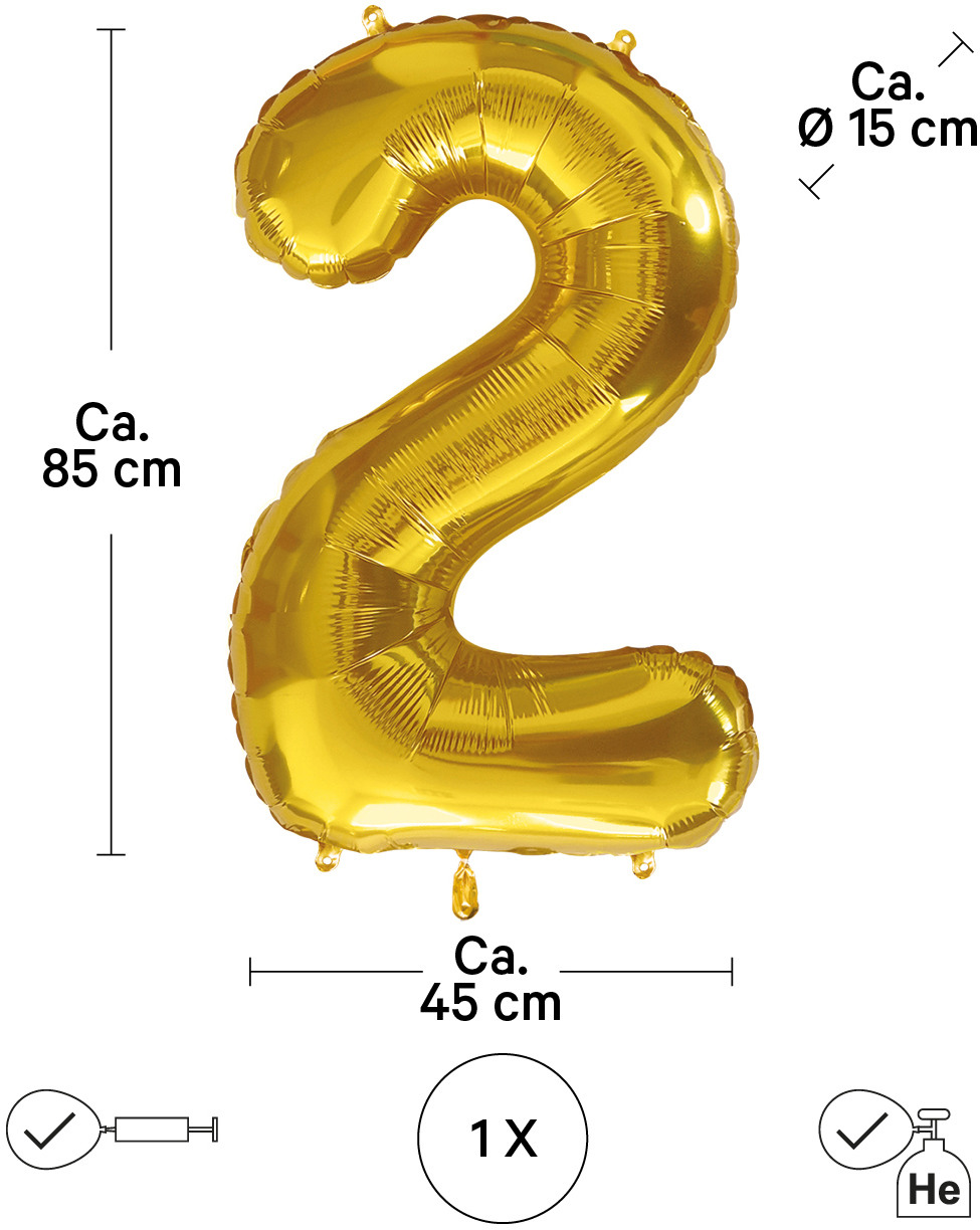 - Eigenschaften: Hochwertiger Folienballon in Form der Nummer “2”, der deiner Feier eine fröhliche Note verleiht. Der Folienballon ist mit praktischen Laschen ausgestattet, um ihn mühelos aufzuhängen. Zudem verschliesst er sich automatisch, sobald er aufgeblasen wurde. Die Folienballone sind in den Zahlen 0 bis 9 erhältlich – so kannst du individuell jede gewünschte Zahl zusammenstellen.