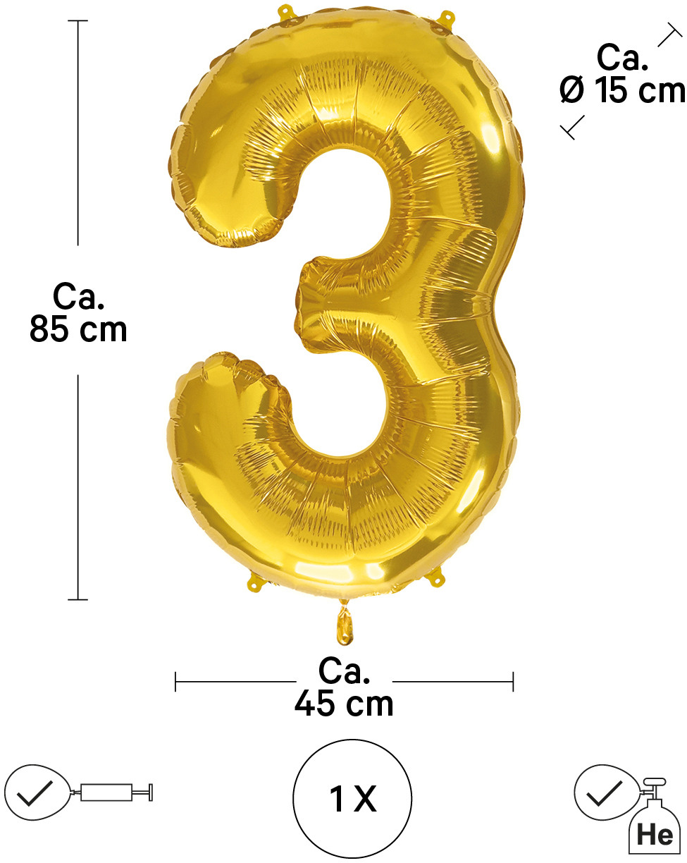 - Eigenschaften: Hochwertiger Folienballon in Form der Nummer “3”, der deiner Feier eine fröhliche Note verleiht. Der Folienballon ist mit praktischen Laschen ausgestattet, um ihn mühelos aufzuhängen. Zudem verschliesst er sich automatisch, sobald er aufgeblasen wurde. Die Folienballone sind in den Zahlen 0 bis 9 erhältlich – so kannst du individuell jede gewünschte Zahl zusammenstellen.