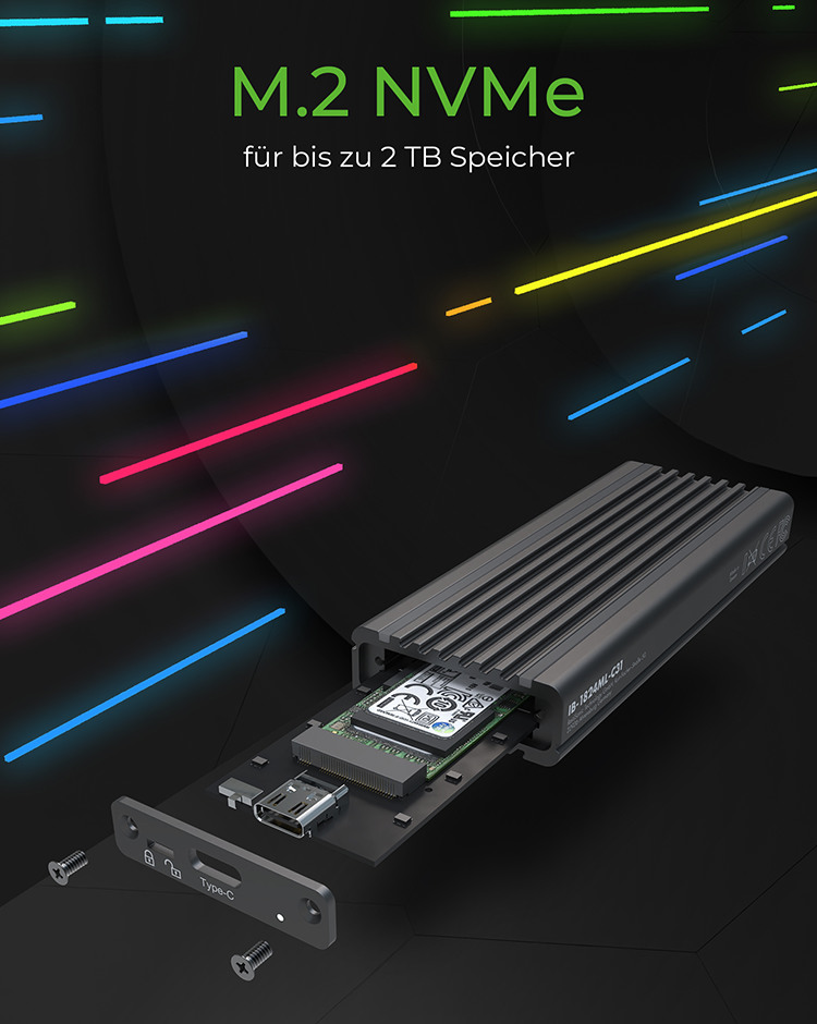 Holen Sie sich das Upgrade für Ihre NVMe SSD und heben Sie Ihren Style auf das nächste Level - mit dem IB-1824ML-C31. Für mehr Individualität sorgen die zwei LED Leisten, die mit fliessend übergehender RGB Ambient-Beleuchtung das Gehäuse verzieren. Durch die patentierte Kühlplatte im Inneren wird die entstehende Abwärme der SSD an das Gehäuse weitergegeben und die SSD somit optimal gekühlt. Dies verhindert die sonst übliche, vorzeitige Reduzierung der Übertragungsrate zum Schutz vor Überhitzung. Mit dem IB-1824M-C31 können Daten also dauerhaft mit maximaler Übertragungsrate von bis zu 10 Gbit/s. Sensible Daten können nun ganz einfach per Schreibschutzschalter vor Löschen oder Veränderung gesichert und wieder freigegeben werden. Mit dem mitgelieferten Mini-Werkzeug und einer kleinen Handbewegung in die gewünschte Position bewegt werden.