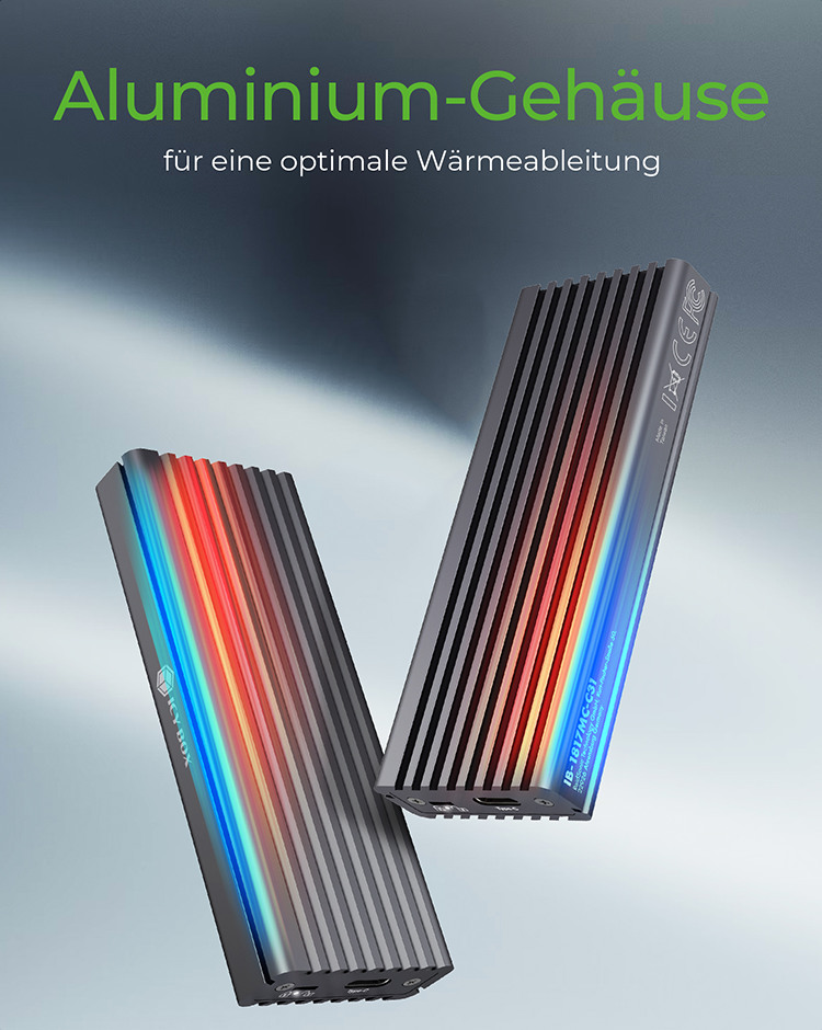 - In diesem Gehäuse kommen drei Kühlungseigenschaften zur Geltung: das Kühlrippendesign des Aluminiumgehäuses, das Silikon Wärmeleitpad, das auf den Datenträger aufgebracht wird und der Kühlkörper, der beides nochmals im Inneren abdeckt. Damit wird bei der
