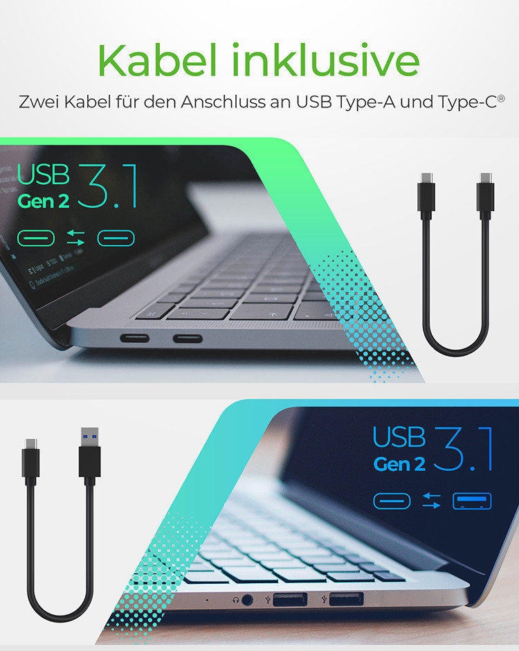 - KABEL INKLUSIVE: Die mitgelieferten Kabel von USB Type-C zu Type-C und Type-C zu Type-A machen die Verbindung mit dem Computer wirklich einfach. Der richtige Anschluss ist immer sofort griffbereit