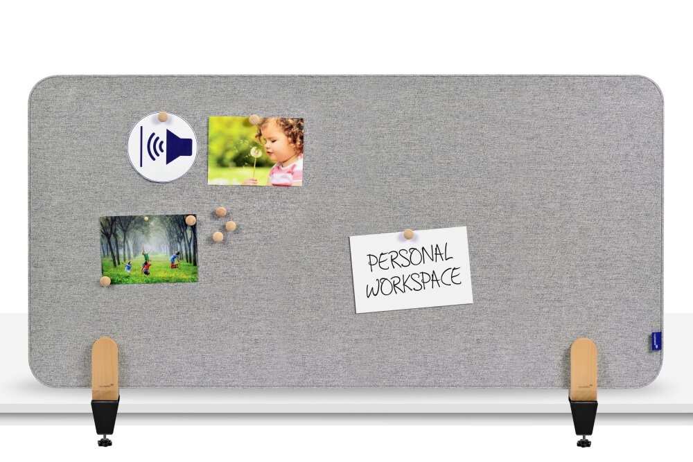 Hochwertige, rahmenlose Tischtrennwand, doppelseitig als schallabsorbierendes Pinboard verwendbar
