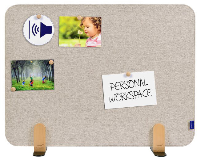 Hochwertige, rahmenlose Tischtrennwand, doppelseitig als schallabsorbierendes Pinboard verwendbar