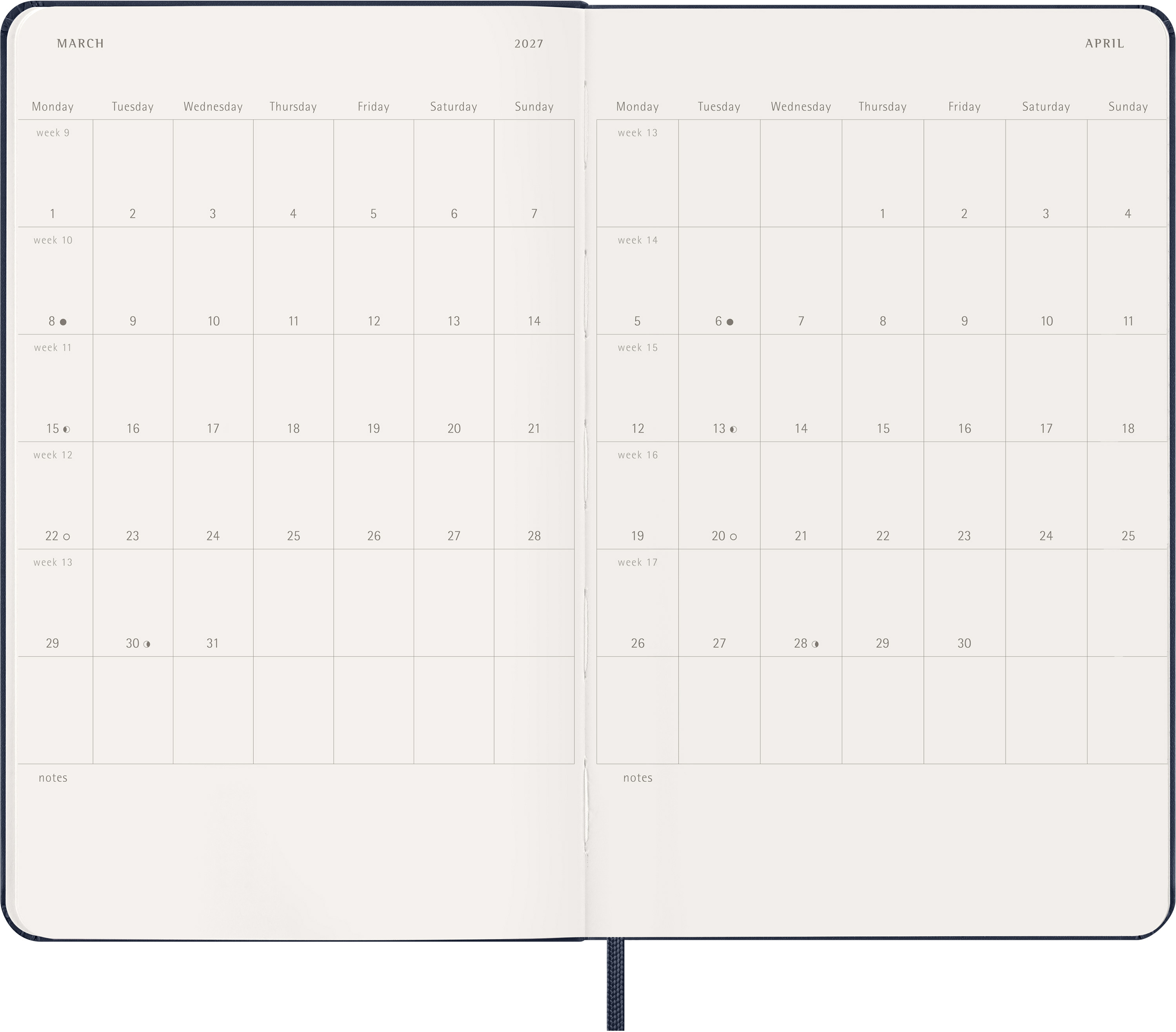 Der 18-Monate Wochen-Notizkalender von Moleskine geht von Juli bis Dezember. Mit den Wochenterminen auf der linken Seite und einer linierten rechten Seite mit Platz für Notizen und Ideen ist dieser beliebte Kalendertyp perfekt für Studenten, Lehrer und Geschäftsleute.