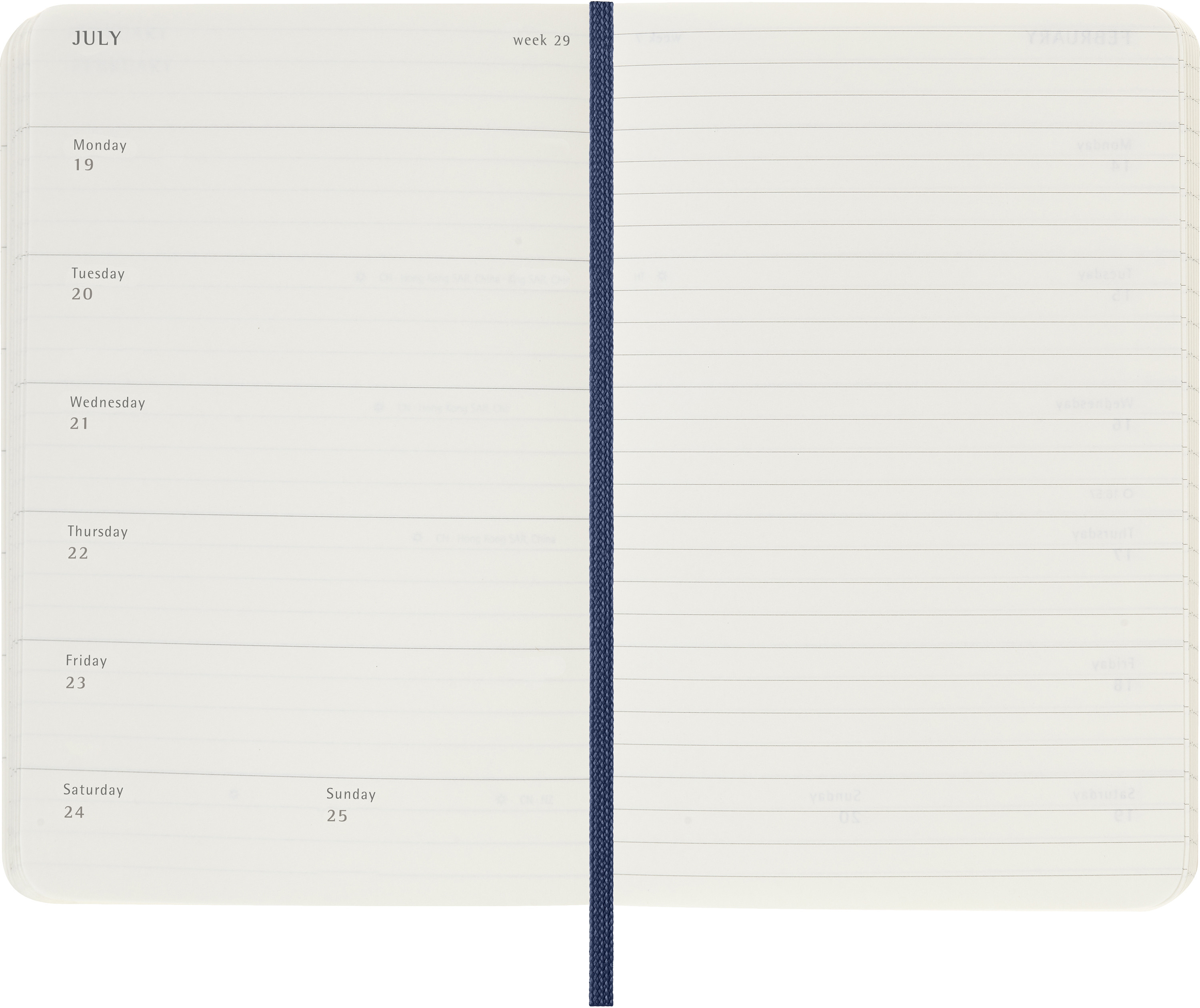 Der 18-Monate Wochen-Notizkalender von Moleskine geht von Juli bis Dezember. Mit den Wochenterminen auf der linken Seite und einer linierten rechten Seite mit Platz für Notizen und Ideen ist dieser beliebte Kalendertyp perfekt für Studenten, Lehrer und Geschäftsleute.
