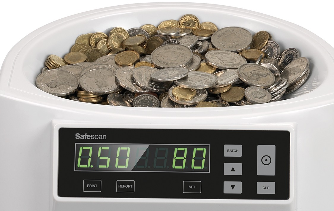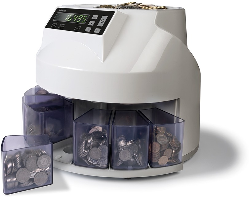Zählt und sortiert 220 Münzen pro Minute • Münzaufnahme: 300-500 Münzen • Mit Additionsfunktion • Gesamtwert und Stückzahl pro Nennwert • Selbstabschaltend, wenn Münzbehälter voll ist • Währung: Schweizer Franken • Gewicht: 5 kg