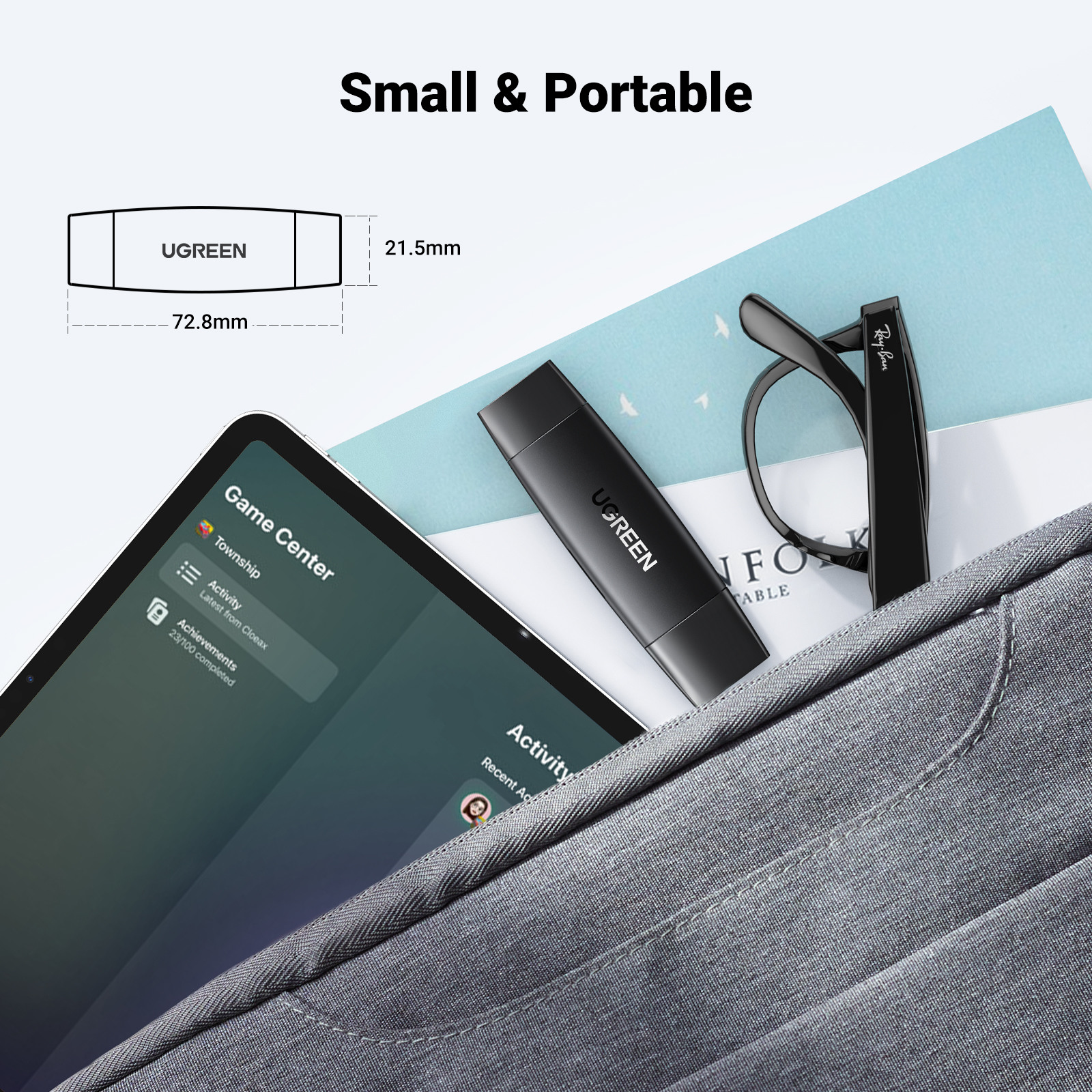 Ugreen kompakter SD- und Micro-SD-Kartenleser. Hergestellt in einem Standard, der eine Datenübertragung von bis zu 5 Gb/s ermöglicht. Ein besonders hervorzuhebendes Merkmal dieses Lesegeräts ist das Vorhandensein von zwei Anschlüssen USB-A und USB-C. Dadurch haben Sie die Möglichkeit, es nicht nur an einen Computer anzuschließen, sondern auch an ein Telefon, das mit einem USB-C-Anschluss mit OTG-Unterstützung ausgestattet ist. Mit dem Lesegerät können Sie zwei Speicherkarten gleichzeitig lesen und beschreiben. Es ist nicht erforderlich, eine Karte herauszuziehen, um die andere einzustecken. Sie können Dateien einfach zwischen Karten oder zum und vom Computerspeicher übertragen. Das Lesegerät kann folgende Speicherkartentypen lesen: SDXC / SDHC / SD / MMC / RS-MMC / Micro SD / TF / Micro SDXC / Micro SDHC / UHS-I.