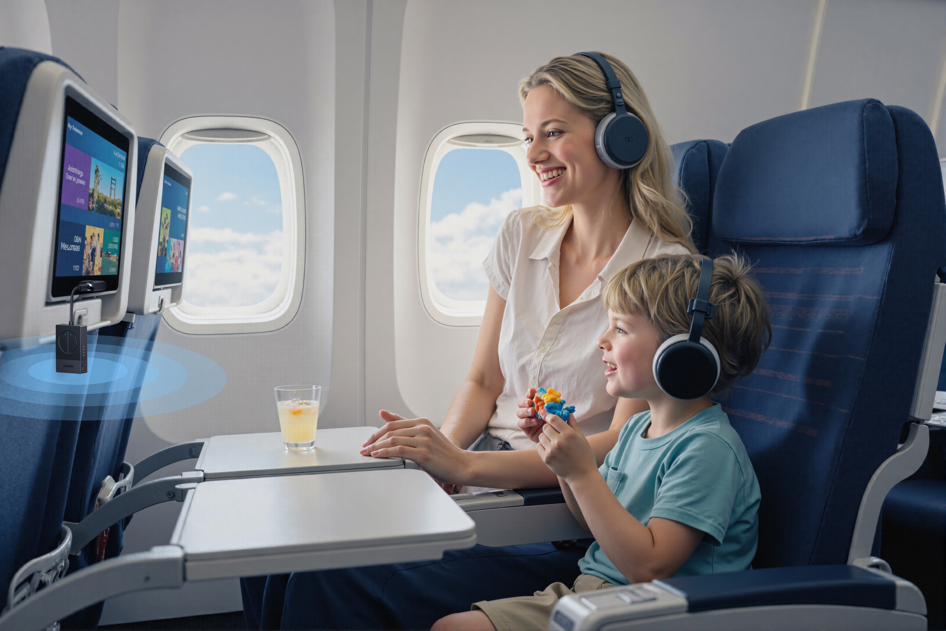 - Doppelte 3,5-mm-Klinkenbuchsen (Flugzeuge): Schließen Sie den Dual-3,5-mm-AUX-Adapter an die 3,5-mm-Klinkenbuchse des Senders an und stecken Sie den Adapter anschließend in die Audioanschlüsse des Flugzeugs.