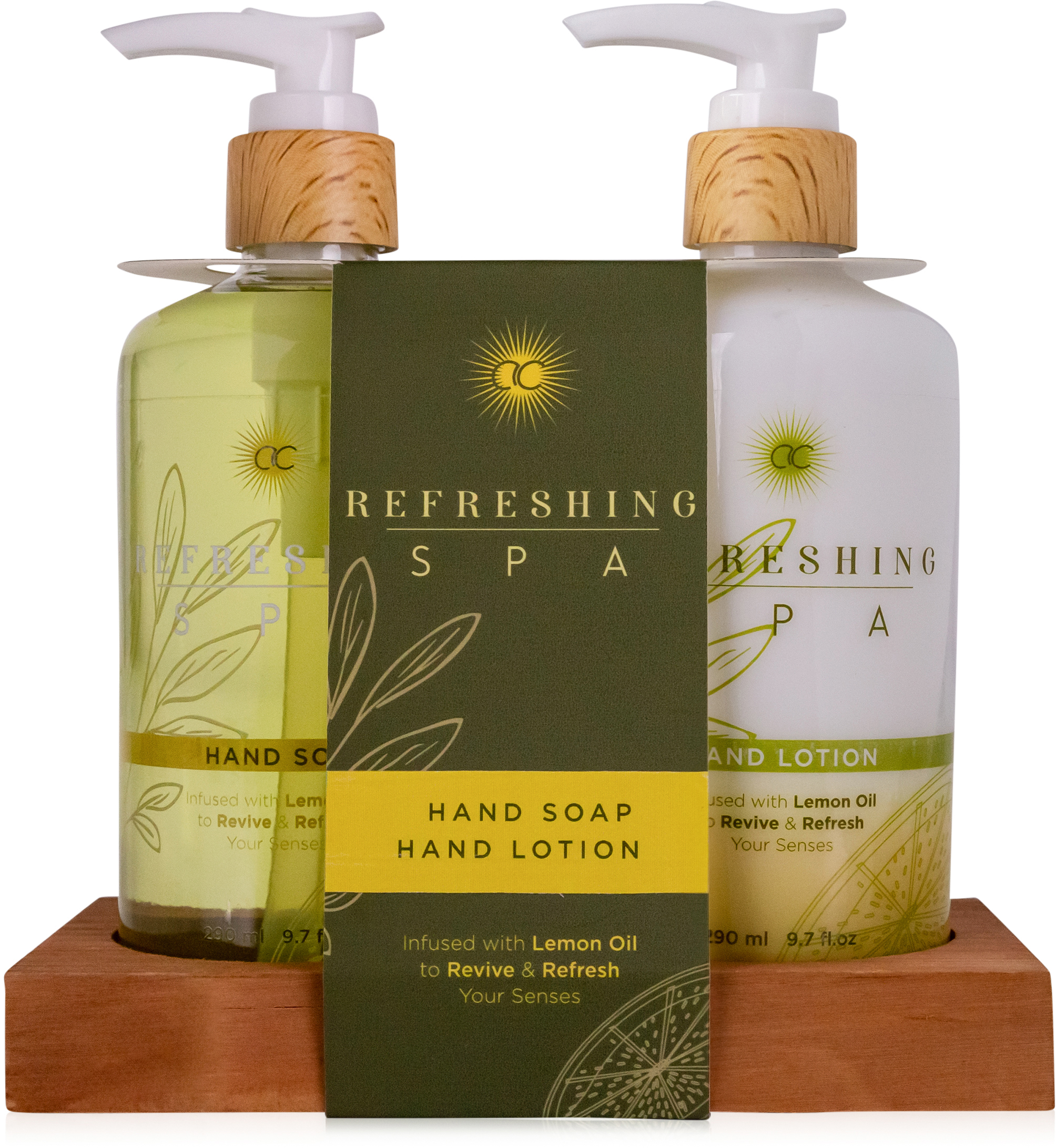 Handpflegeset REFRESHING SPA auf Holztray, inkl. 290ml Handseife und 290ml Handlotion in Pumpspender, angereichert mit Zitronenöl, Duft: Lemon & Jasmine, Farbe: grün/gelb, VE 6