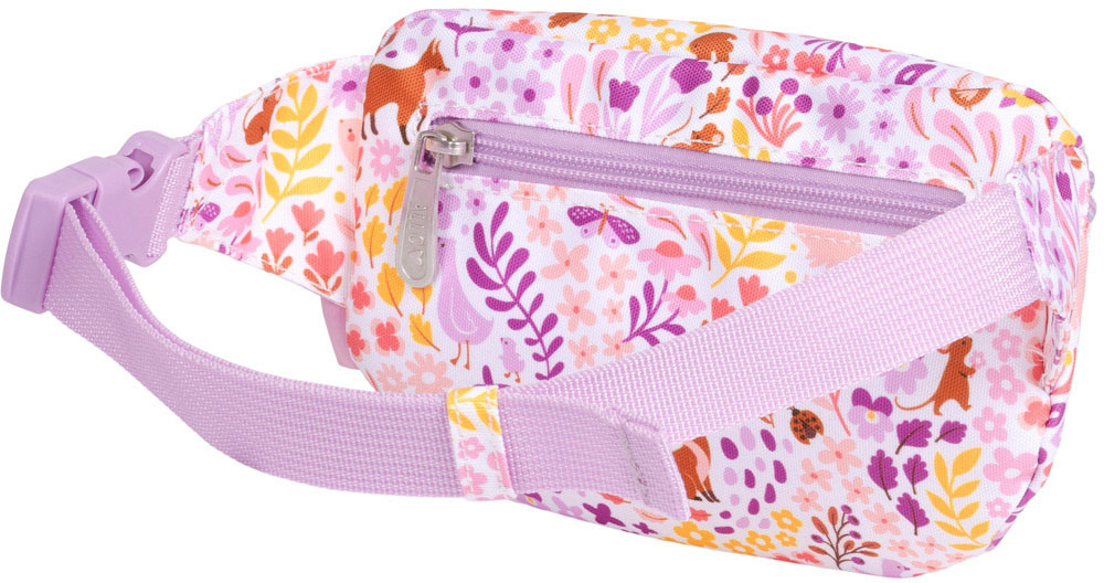 Lila Gürteltasche mit Blumen in Kindergröße. Die Tasche verfügt über einen verstellbaren Tragegurt, sodass die Tasche auch als Crossbody Bag getragen werden kann. In die Vordertasche passen bequem Geldbörse und Handy. Auf der Rückseite befindet sich eine zusätzliche Reißverschlusstasche, die sich ideal für kleine Wertgegenstände eignet.