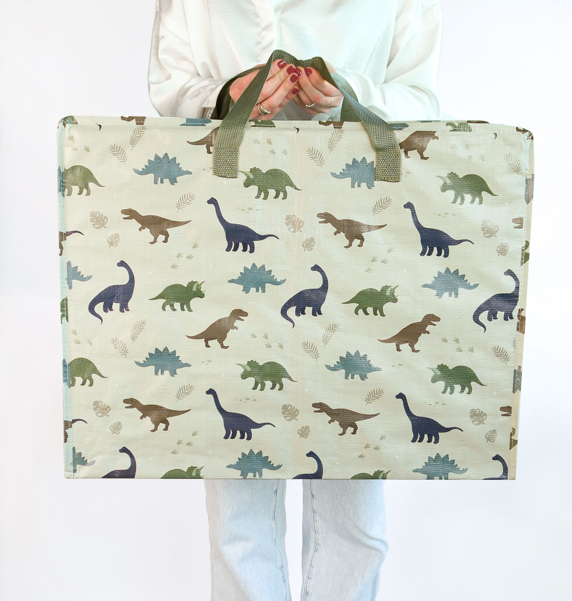 Diese grosse Aufbewahrungstasche mit Dinosaurier-Aufdruck ist ideal für die Aufbewahrung von Kleidung, Decken und Spielzeug, kann aber auch ideal als Strand- oder Badetasche verwendet werden. Die Tasche besteht aus recyceltem Plastik und wird mit einem Reissverschluss geschlossen. Die Tasche kann auch leicht zusammengefaltet werden, was sie praktisch für die Aufbewahrung macht.