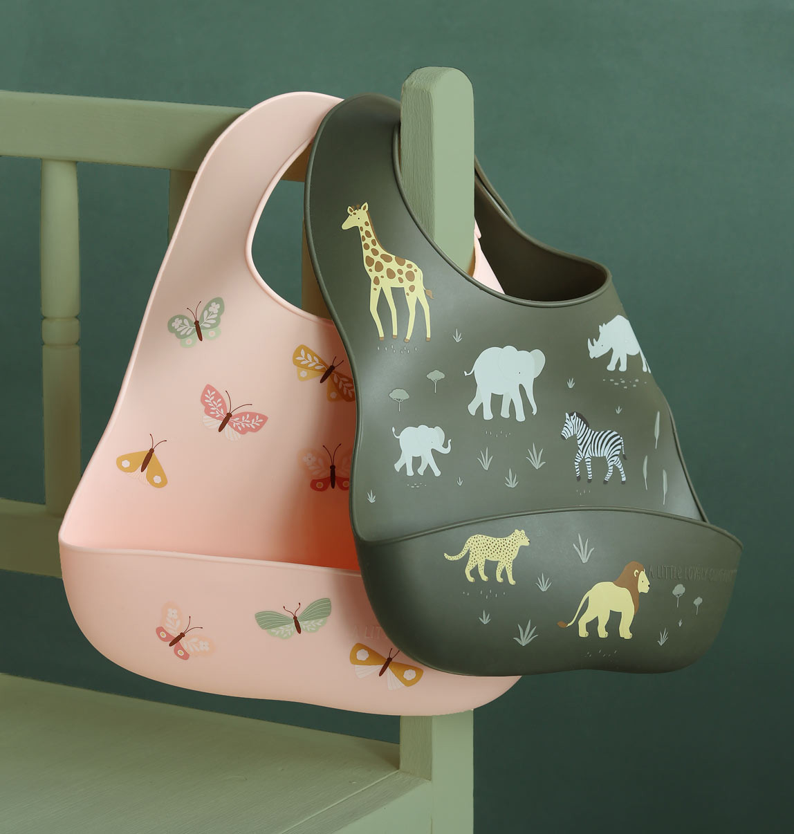 Set mit zwei Silikonlätzchen - eines mit Schmetterlingenaufdruck und eines in passender Unifarbe. Die Lätzchen bestehen aus weichem, food-grade Silikon, sind wasser- und schmutzabweisend und haben eine breite Tasche auf der Vorderseite, die sich ideal zum Auffangen von Essen eignet. Der verstellbare Halsverschluss macht sie für Babys und Kleinkinder geeignet. Die Silikonlätzchen sind leicht zu reinigen und durch Aufrollen leicht zu verstauen.