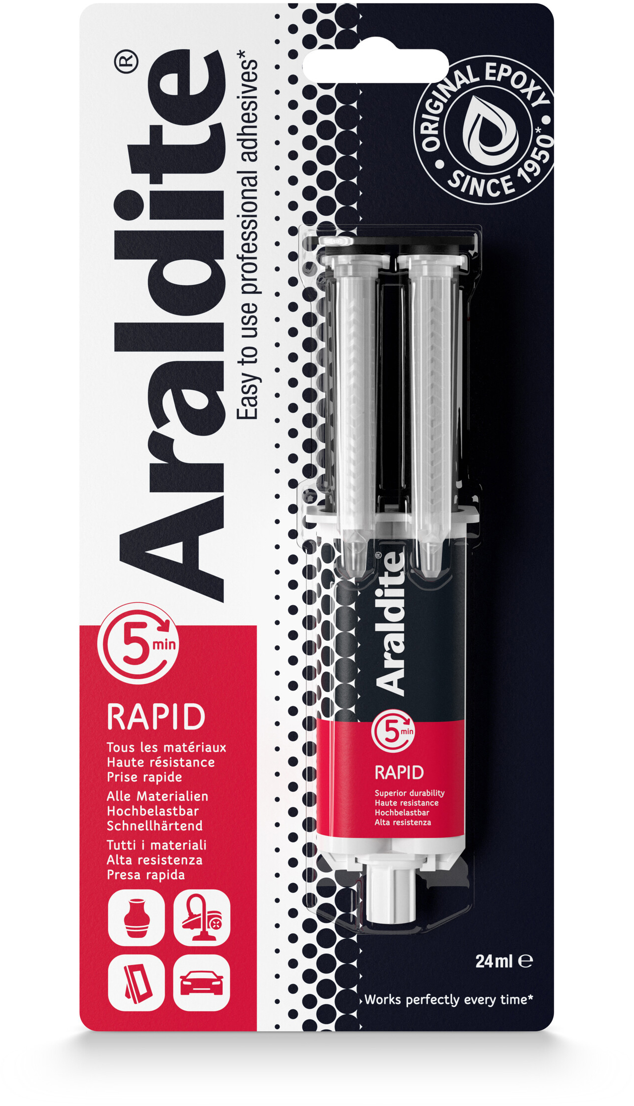 Leistungsstarker, lösemittelfreier, langzeit- und wasserbeständiger Klebstoff, schleifbar und überstreichbar. Klebt Metal, Holz, Mauerwerk, Keramik, Glas, trockener Beton, Holzspanplatten, Leder, Karton, Gewebe, Gummi und die meisten Kunststoffe (ausser Polyethylen, Polypropylen, Teflon®). Vergewissern Sie sich, dass die Oberflächen sauber und frei von Staub, Rost, Schmutz und Fett sind. Für eine optimale Verklebung von Kunststoff und Metall bitte die Oberflächen mit einem Lösemittel entfetten und leicht mit Schmirgelpapier aufrauen. Lassen Sie 2 Stunden auf voller Stärke zu erreichen. Araldite® Rapid 2K ist ein starker Zweikomponentenklebstoff mit schneller Härtung. Gute Beständigkeit gegen Öl, Chemikalien und Schlag, hohe Temperaturbeständigkeit (-30°C bis 80°C).